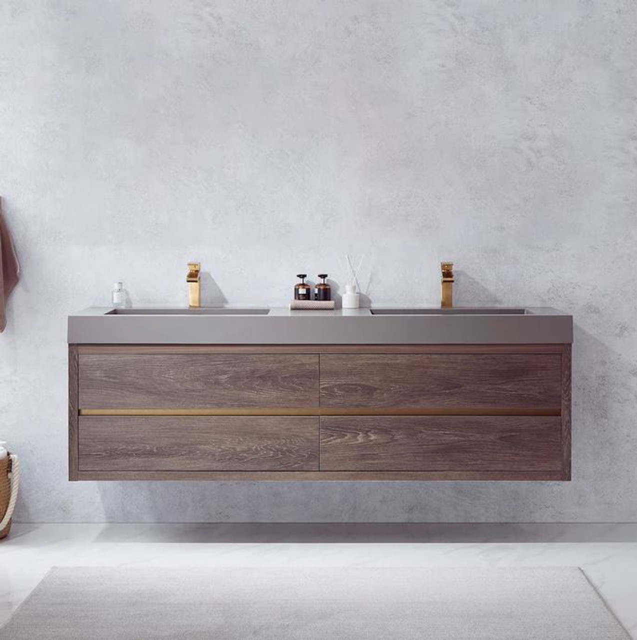 72" Double Sink Wall-Mount Bath Vanity in North Carolina Oak with Grey Composite Integral Square Sink Top