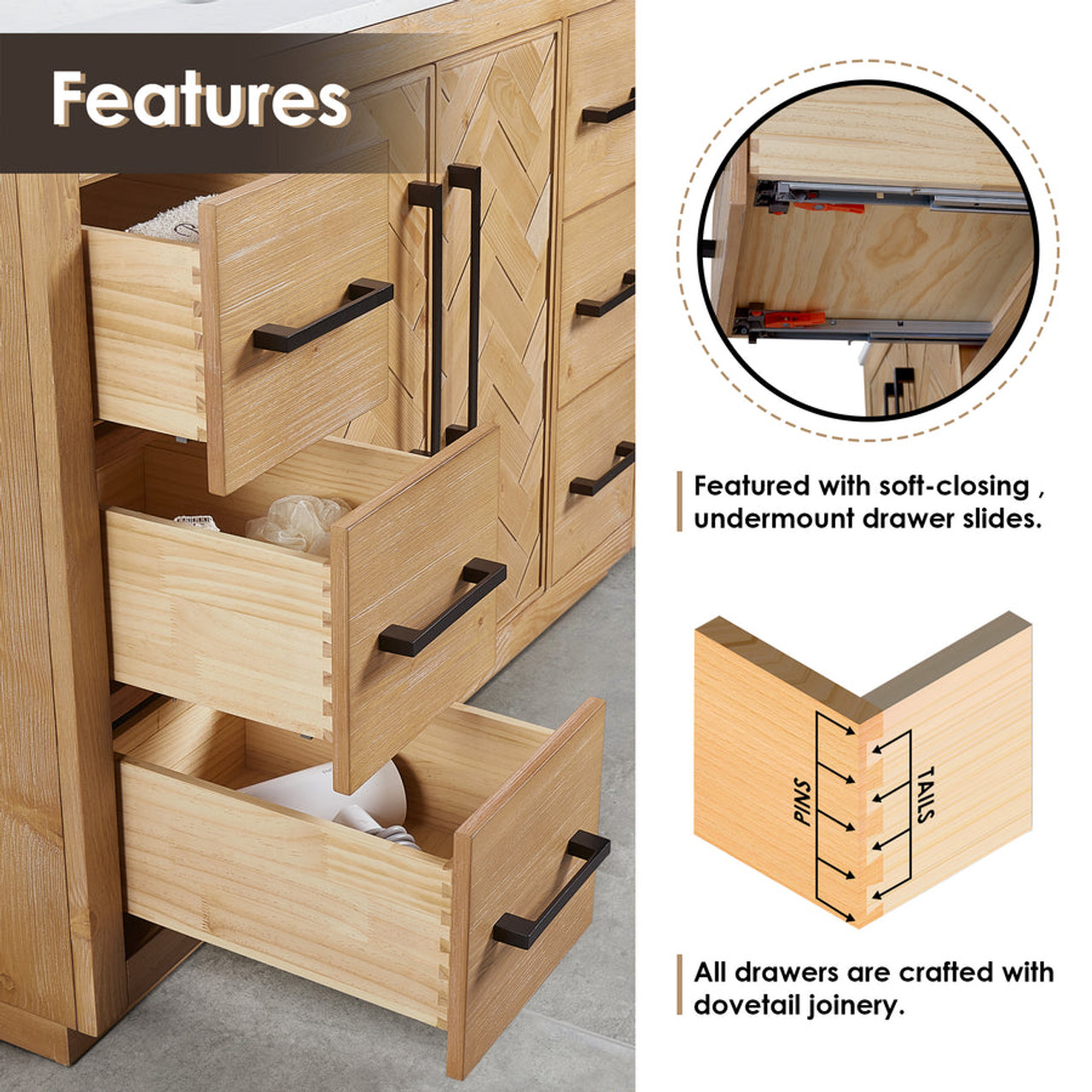 Looking for a light, bright, and natural sense of your bathroom? Bellavia vanity features with weathered fir that showcases a unique and rustic charm. Finely handcrafted jointing door front with a chic chevron pattern creates a modern and sophisticated aesthetic. By creating a recessed plinth base at the bottom, enhance the visual appeal and sophistication of space. With a beautifully marbled engineered stone countertop, our vanity adds class, distinction, and functionality to any guest or master bath in your home.