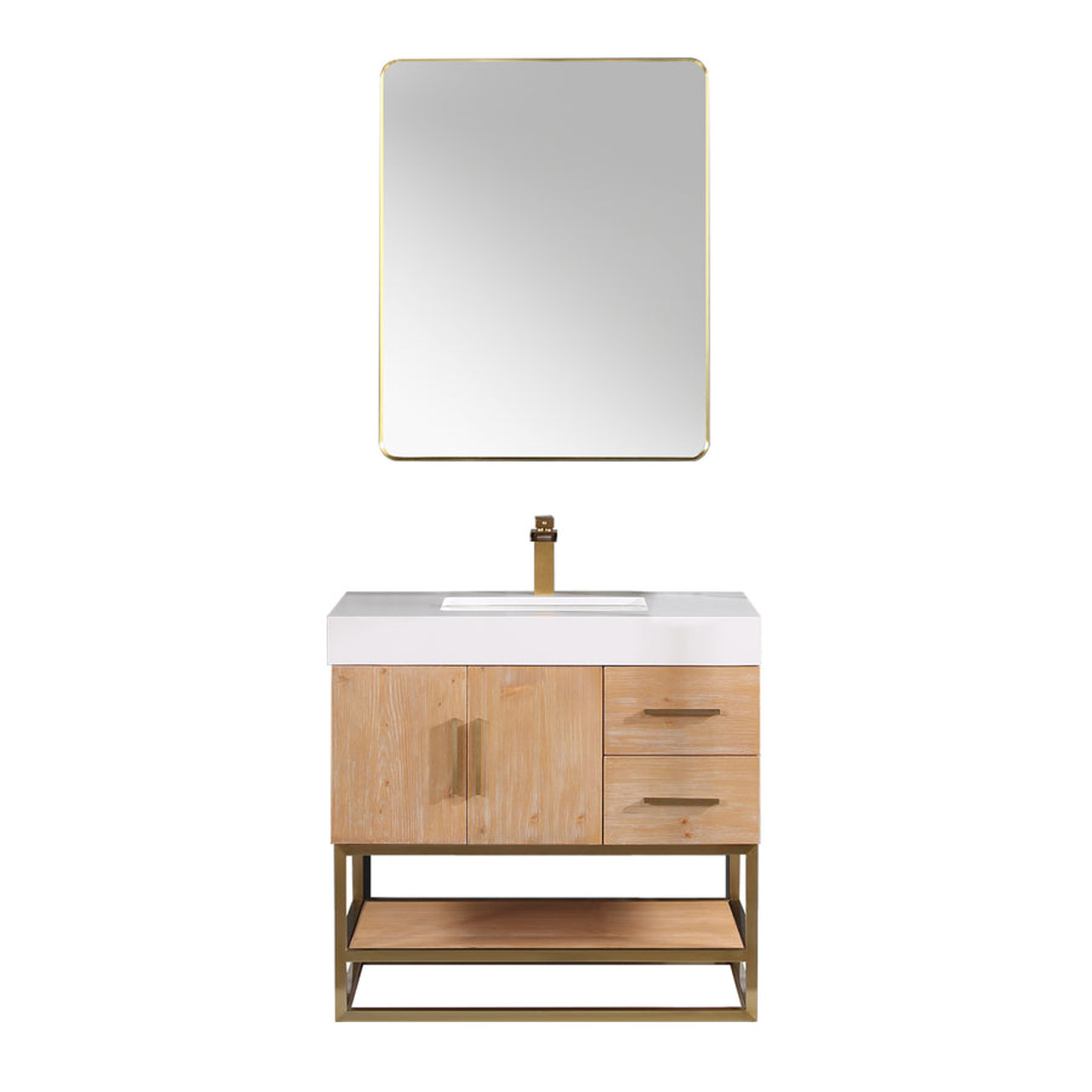 - Single, matching framed aluminum mirror in stylish Matte Black or Brushed Gold finish.