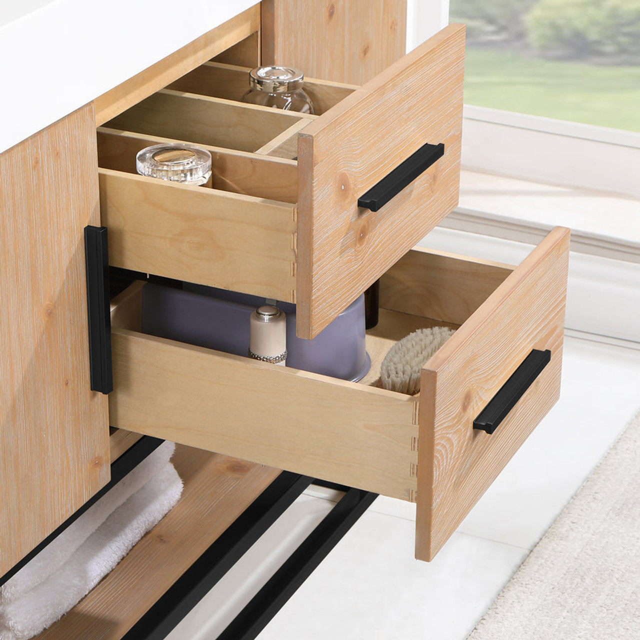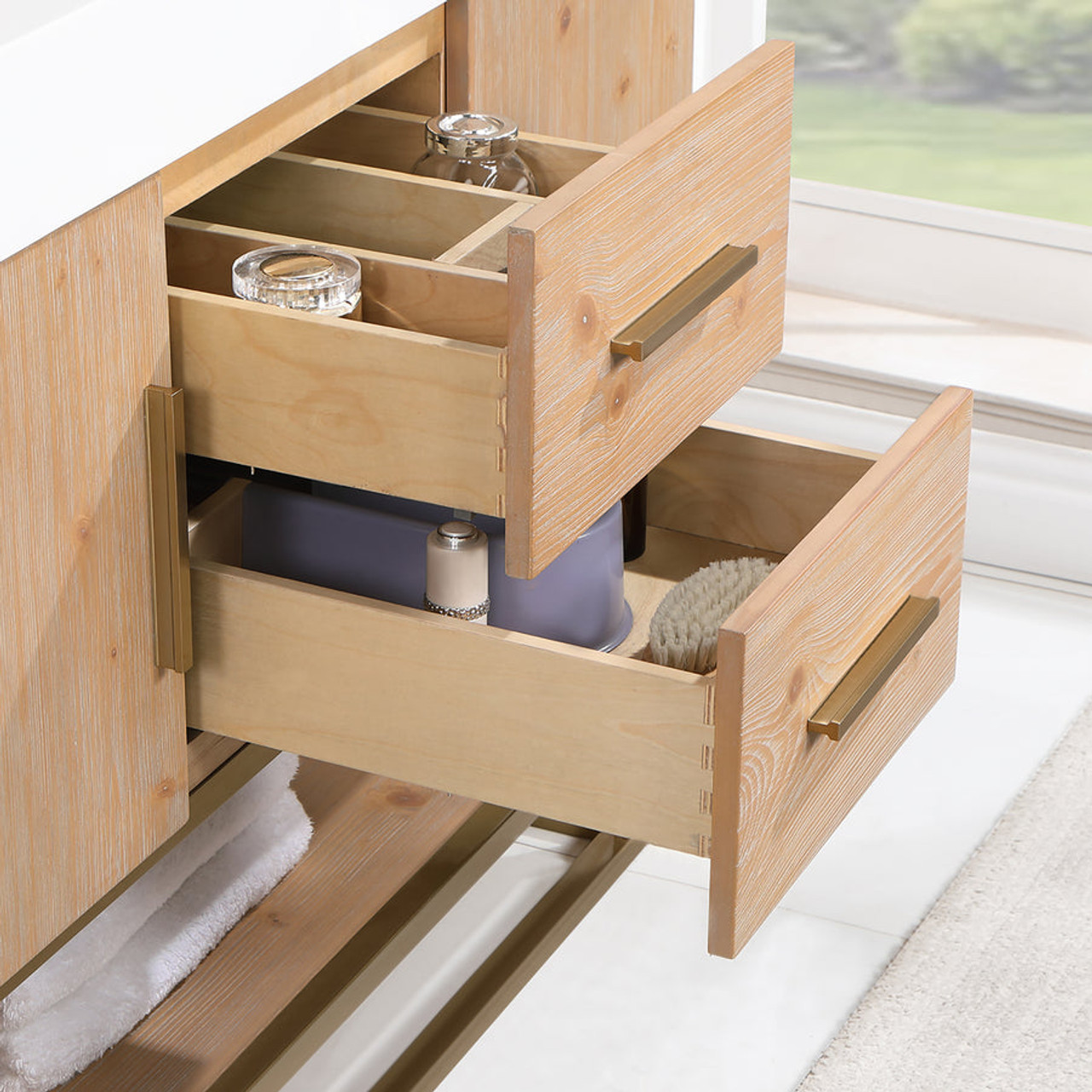 Ready to redefine the look of your guest or master bath? Our Bianco vanity series lends a distinctive contemporary edge to any space, blending the warmth and texture of natural wood with the clean, crisp aesthetic of solid stone. High style doesn’t mean compromising on storage; the Bianco offers ample space for all your accoutrements—with doors and drawers that glide gracefully open and shut. An unconcealed lower shelf provides the perfect spot to customize your vanity with fluffy rolled towels and decorative items.