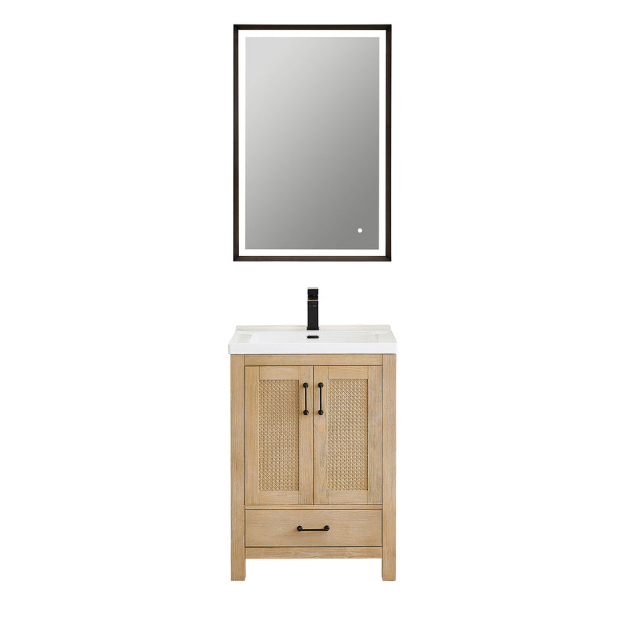Incorporate the beauty of nature into your bathroom with Bondi Vanity. Woven from natural rattan, this beautiful bathroom cabinet is intricately handcrafted to showcase the fine details. For your convenience, the sink is designed to keep the bathroom dry and tidy from water spills with its show stopping curved edge barrier. Its countertop is designed with a classic white basin- adding a versatile and timeless touch for any creative bathroom remodel.