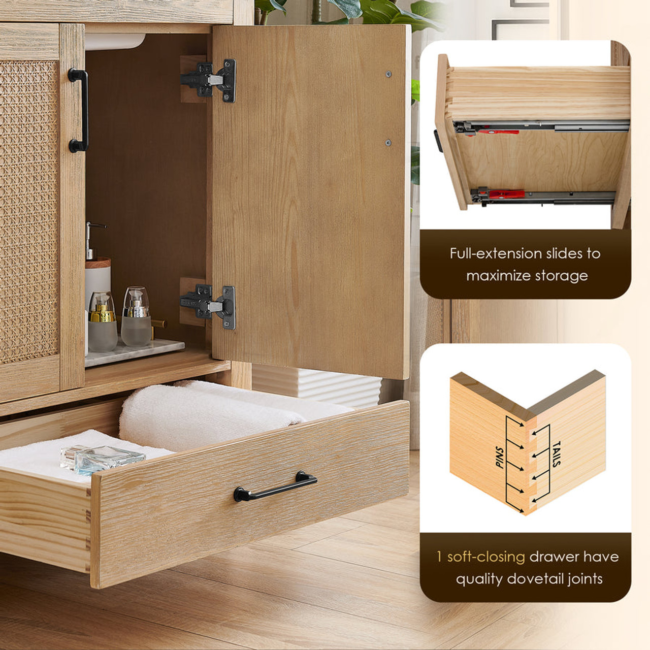 - 1 soft-closing drawer, featuring robust dovetail joints, offers ample storage space for all your bathroom essentials