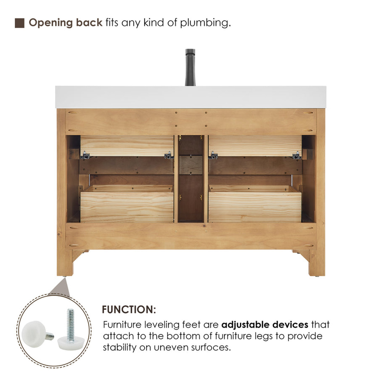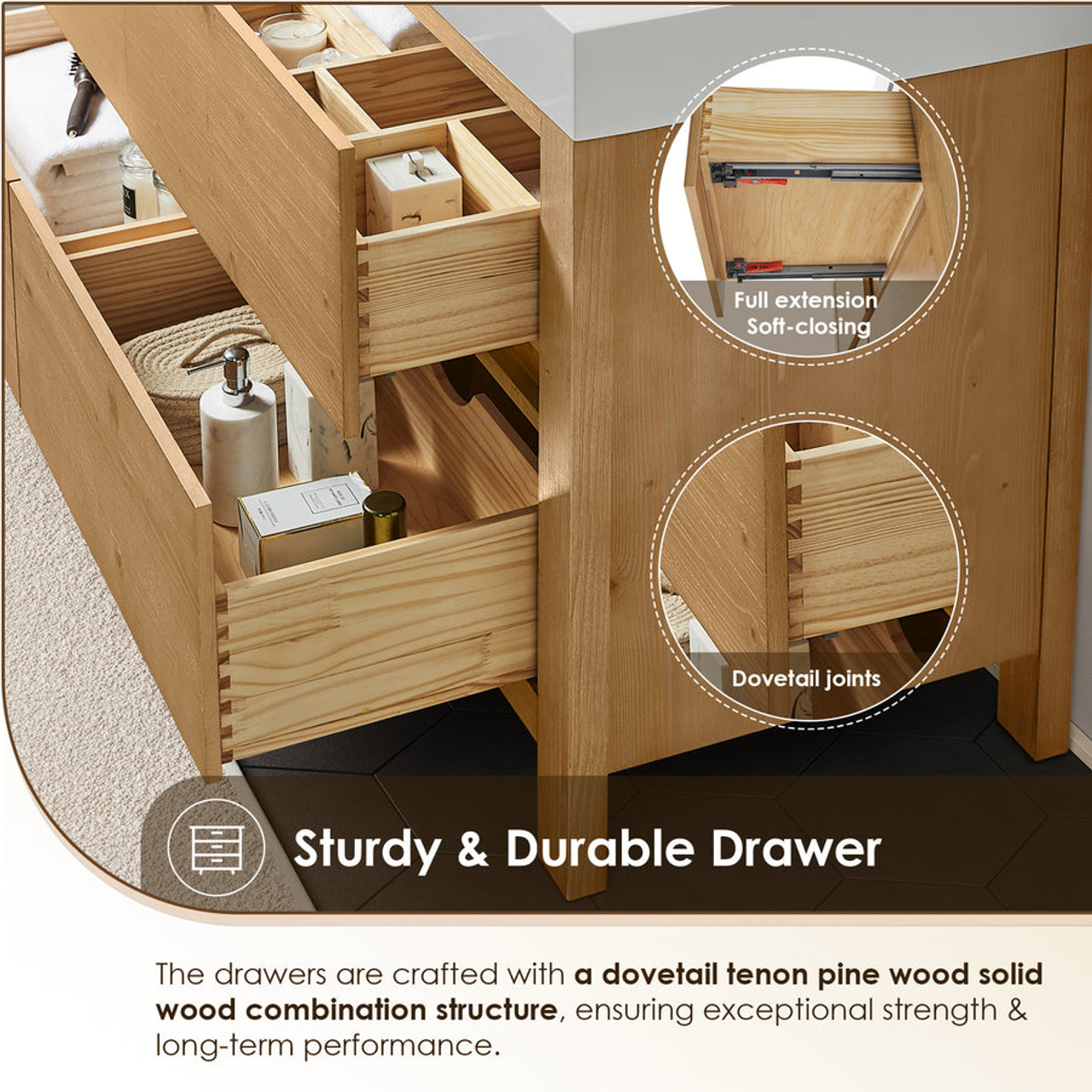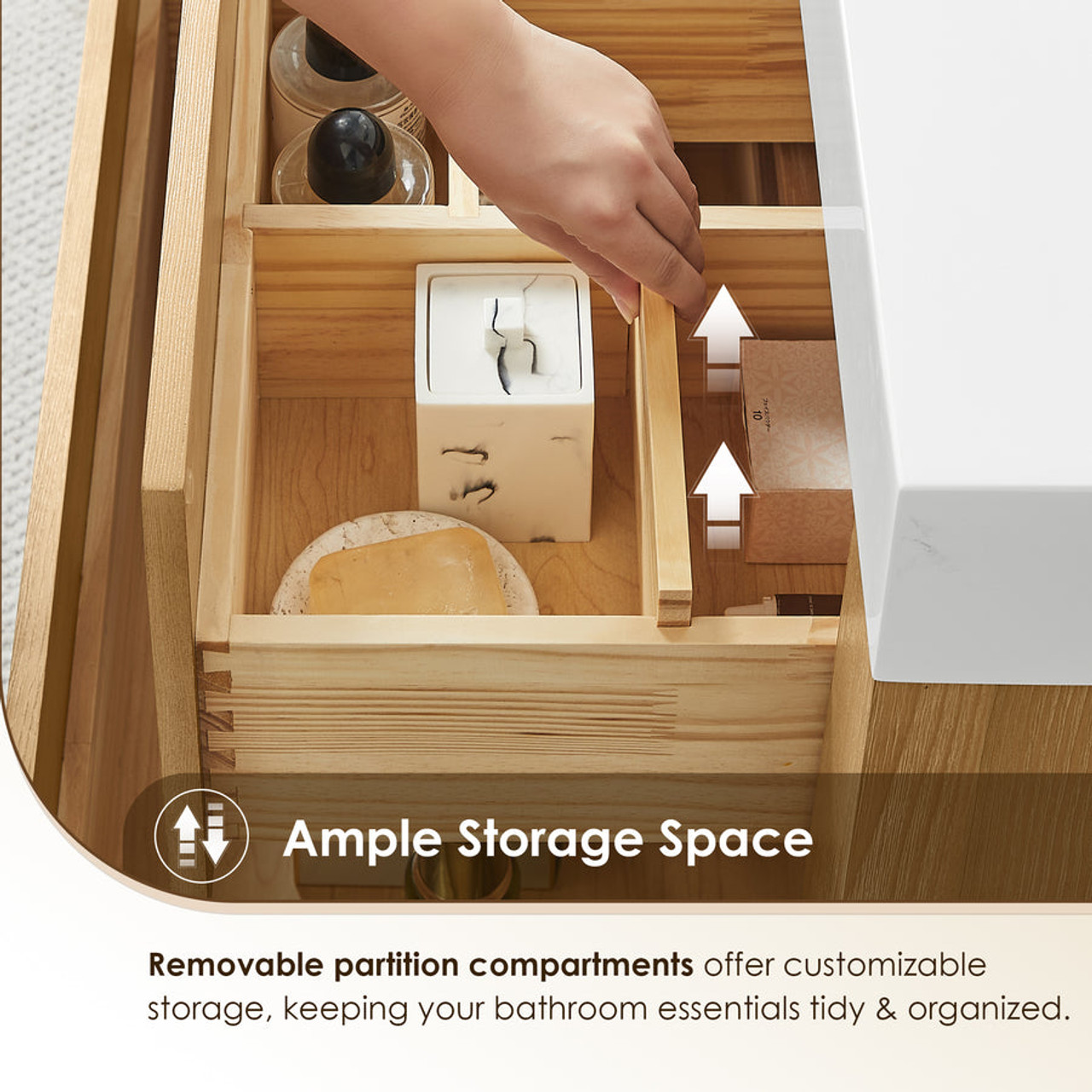 - Functional storage layout: The cabinet integrates a wooden U-shaped groove that optimizes space for versatile storage options. Functionally separated drawers provide a thoughtful, well-organized solution for storing toiletries, towels, and other essentials.