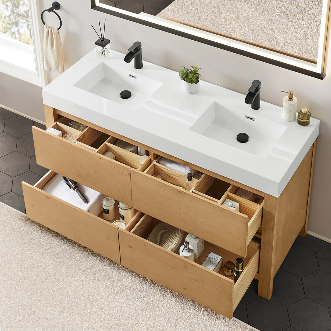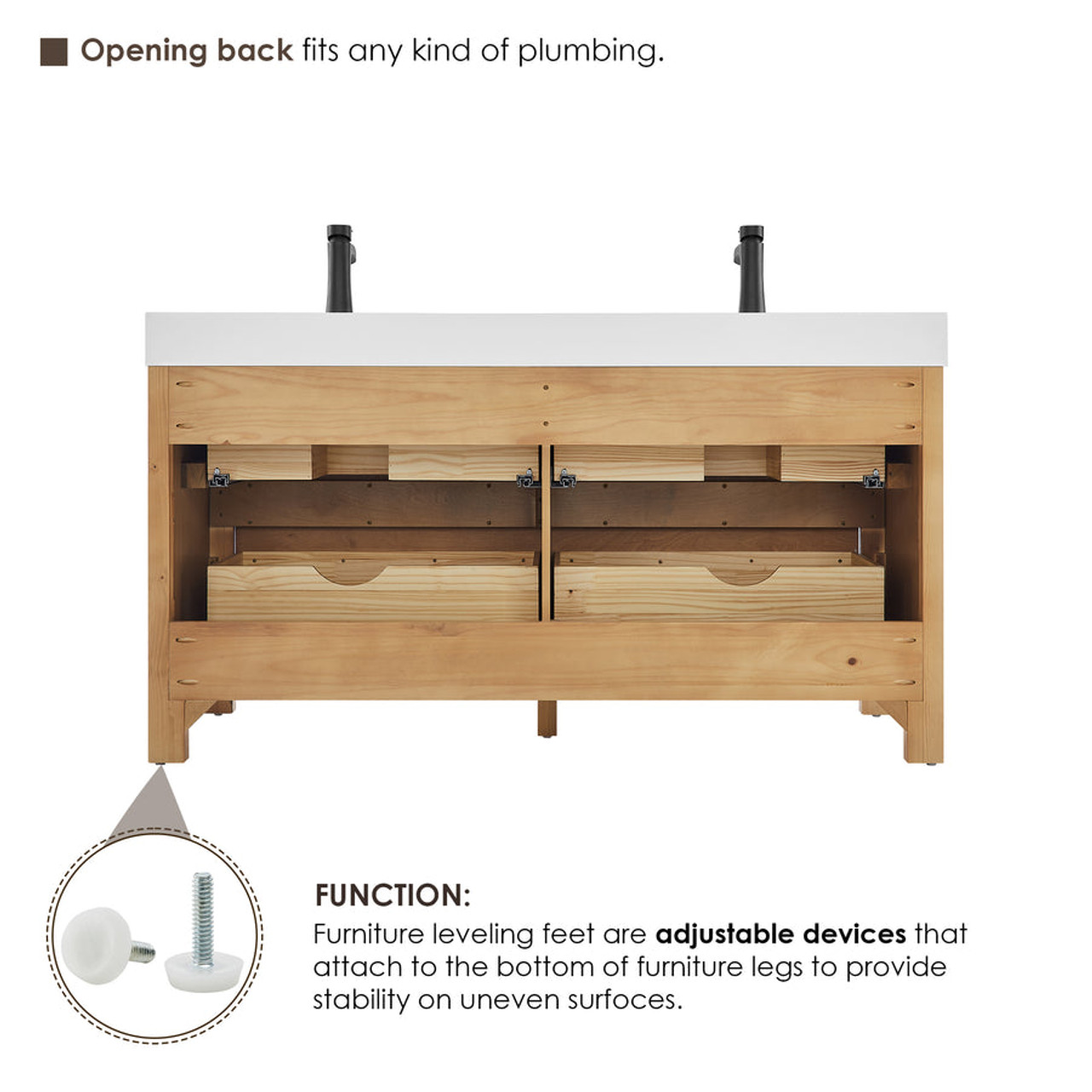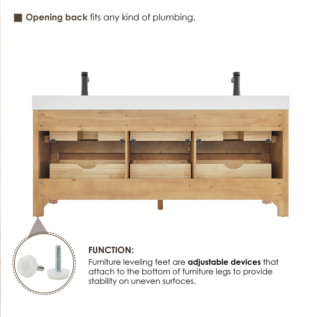 - Functional storage layout: The cabinet integrates a wooden U-shaped groove that optimizes space for versatile storage options. Functionally separated drawers provide a thoughtful, well-organized solution for storing toiletries, towels, and other essentials.