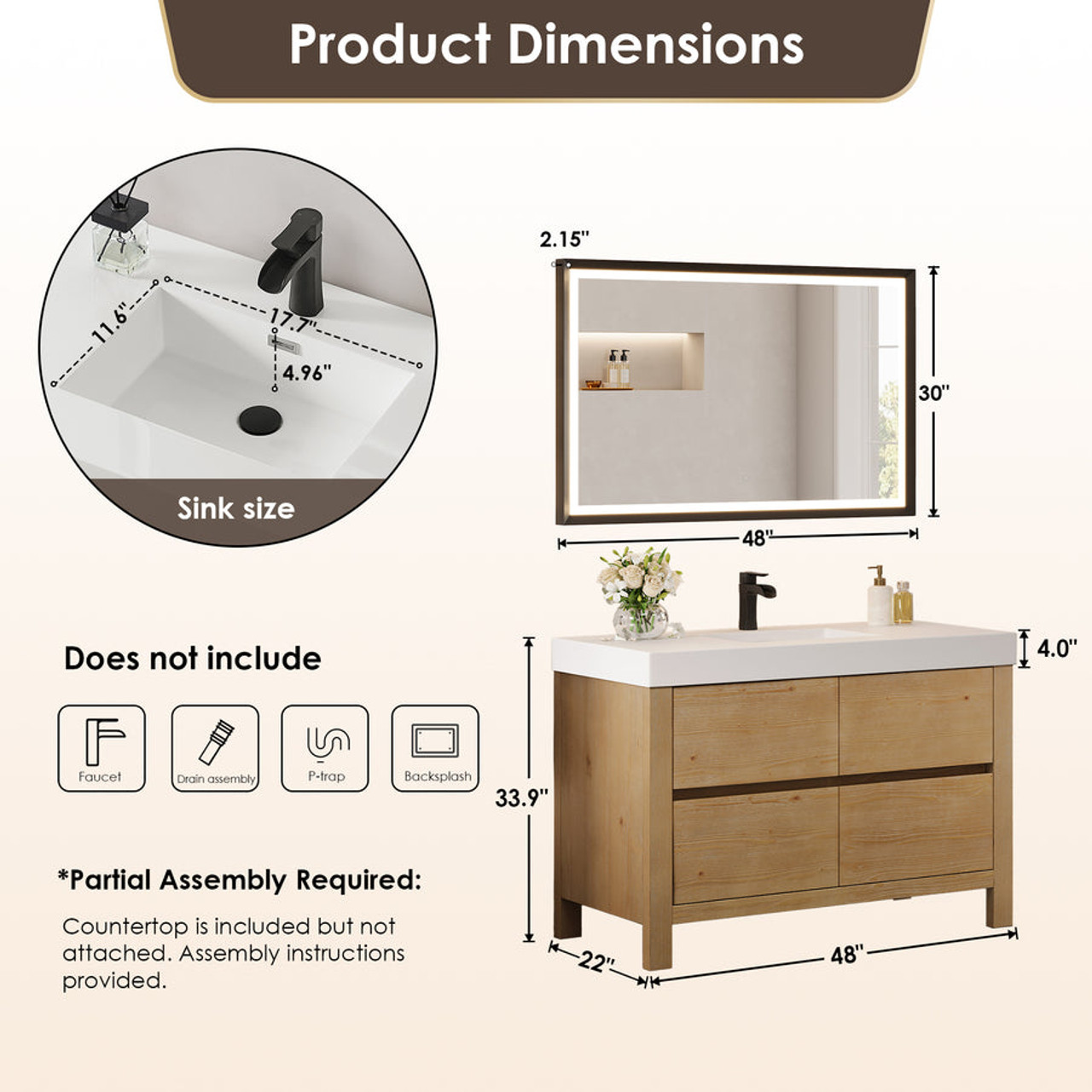 - Partial assembly required: Countertop is included but not attached. Assembly instructions provided.