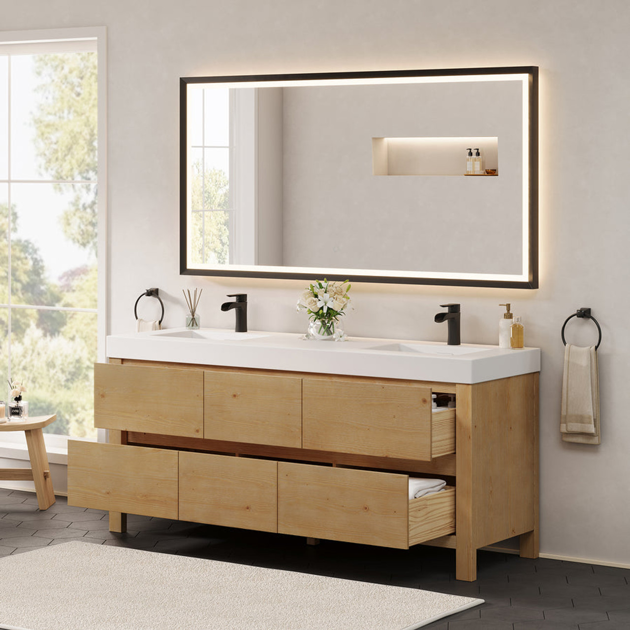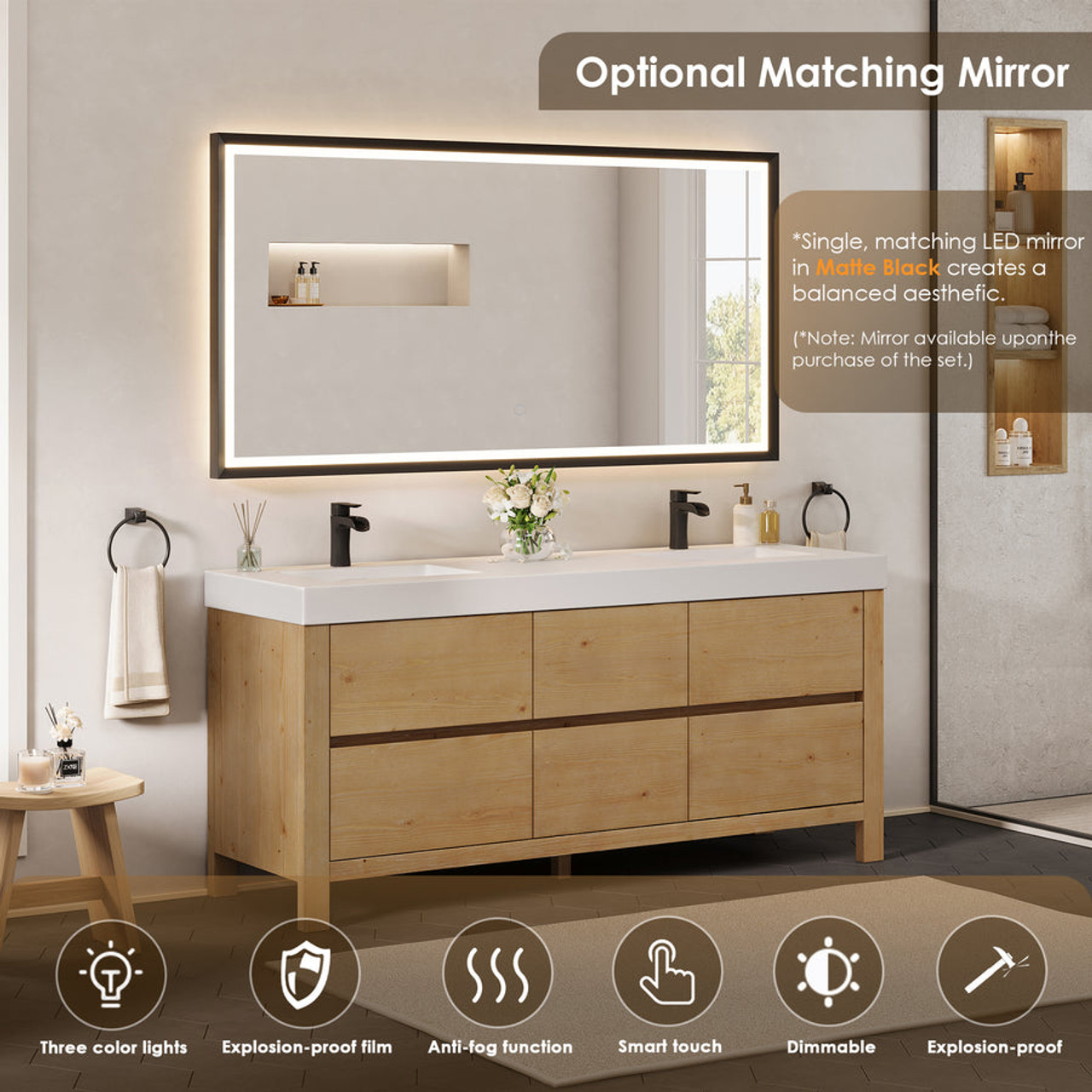 - Optional matching mirror(s): Single, functional LED mirror in Matte Black creates a balanced aesthetic. (Note: Mirror available upon purchase of the set.)