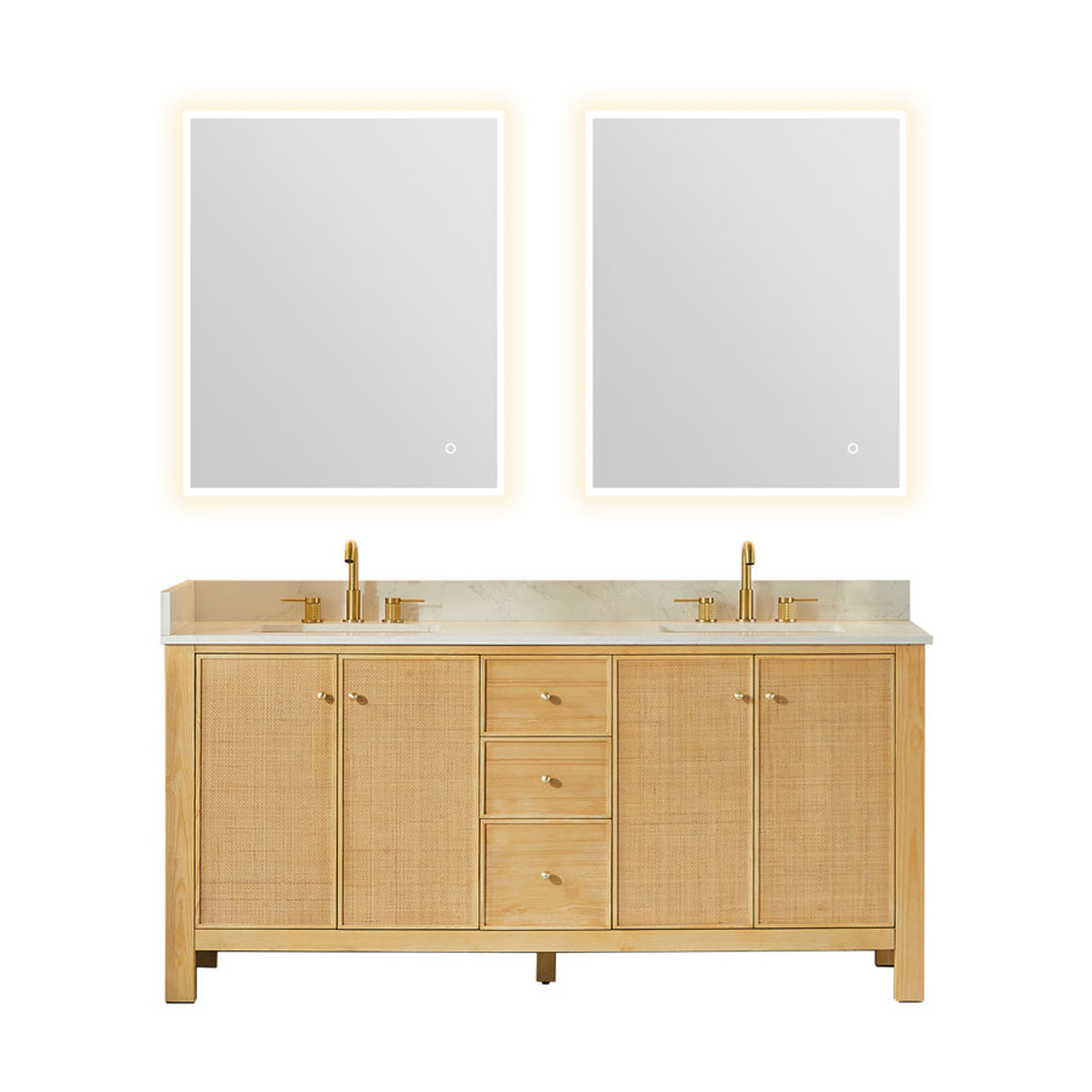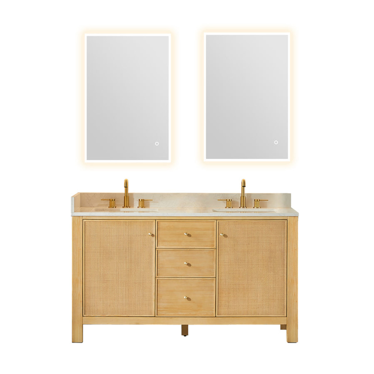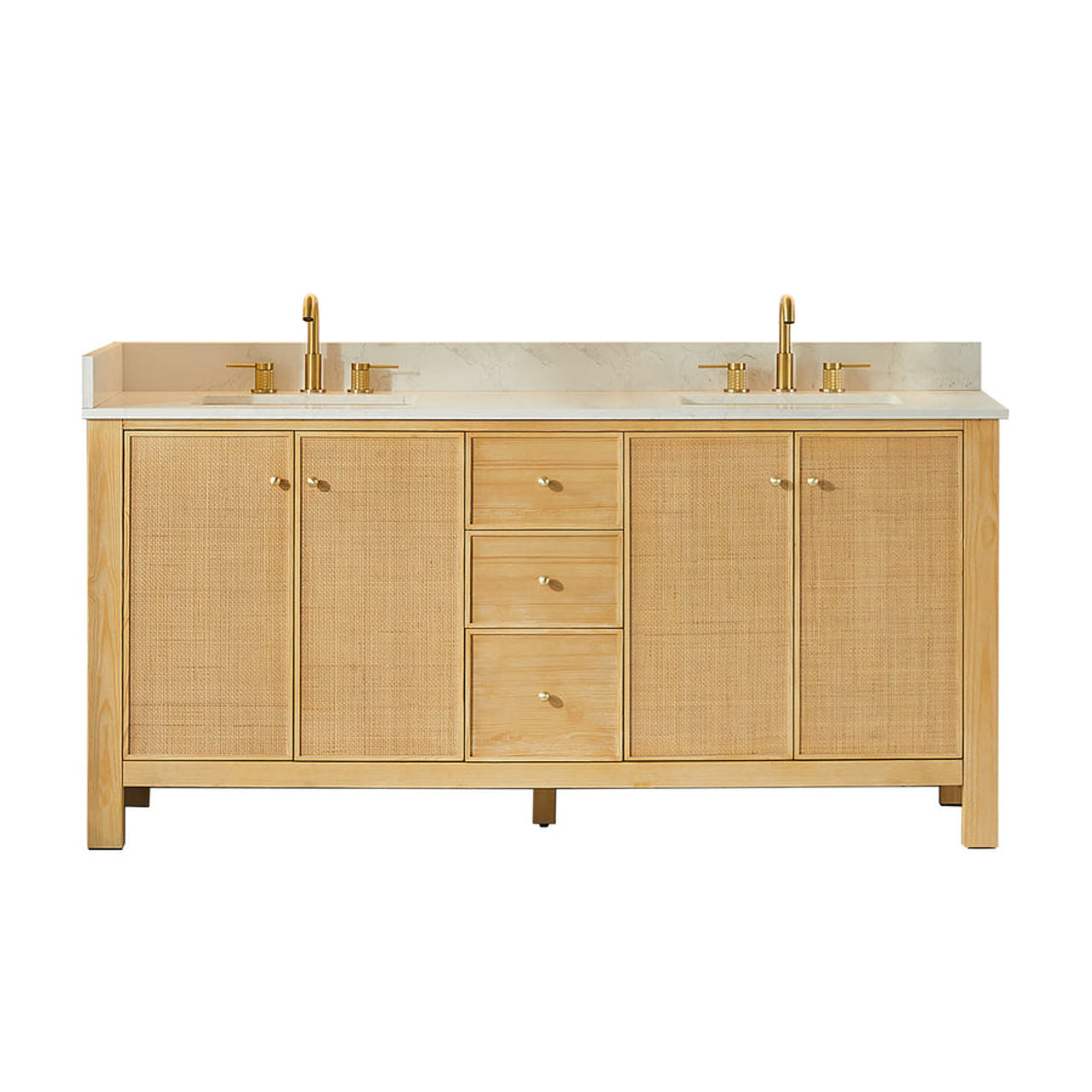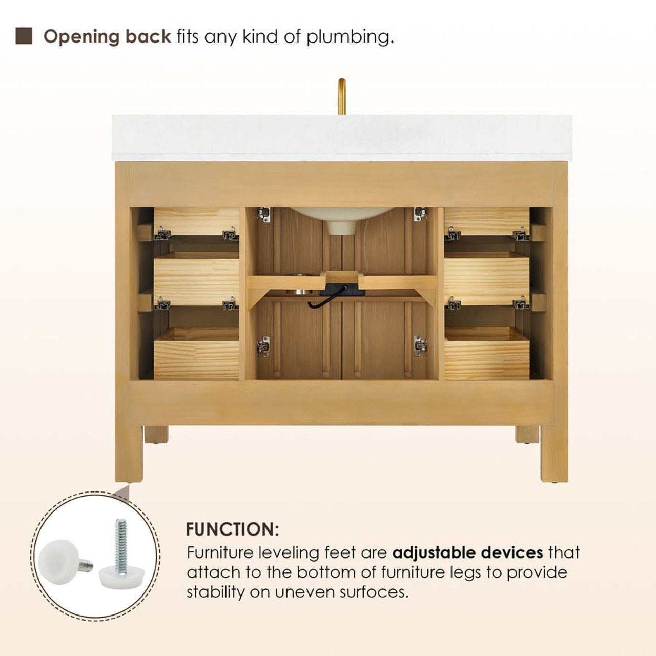 Crafted from ultra-rugged spruce wood, our Cedar Bathroom Vanity boasts unique cane-patterned doors that lend a warm, rustic feel to your space. This gorgeous vanity is full of surprises, from the golden spherical handles to the cleverly designed storage space within—complete with built-in UL-certified power and USB outlets. Impeccable craftsmanship is apparent with every detail, such as the Cedar’s dovetail drawers and door with soft-closing technology. This vanity is crowned with a striking, wear-resistant composite stone countertop that features elegantly understated marbling.