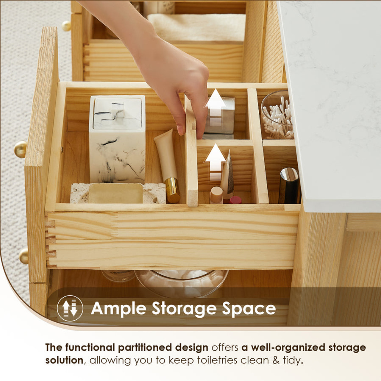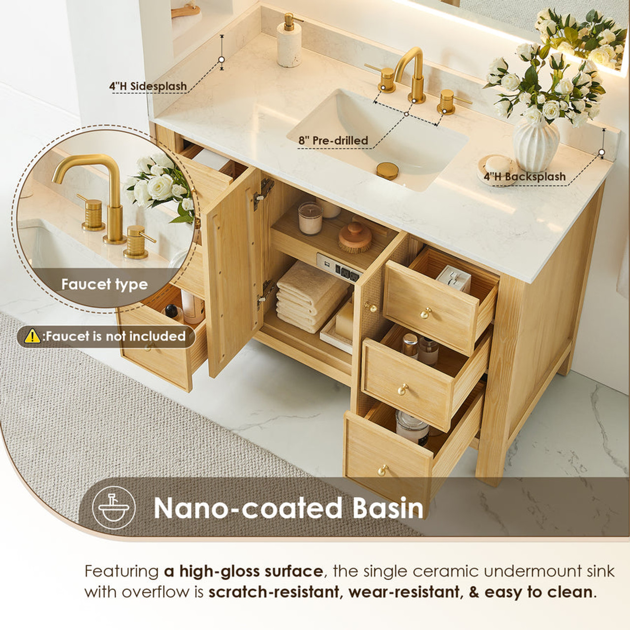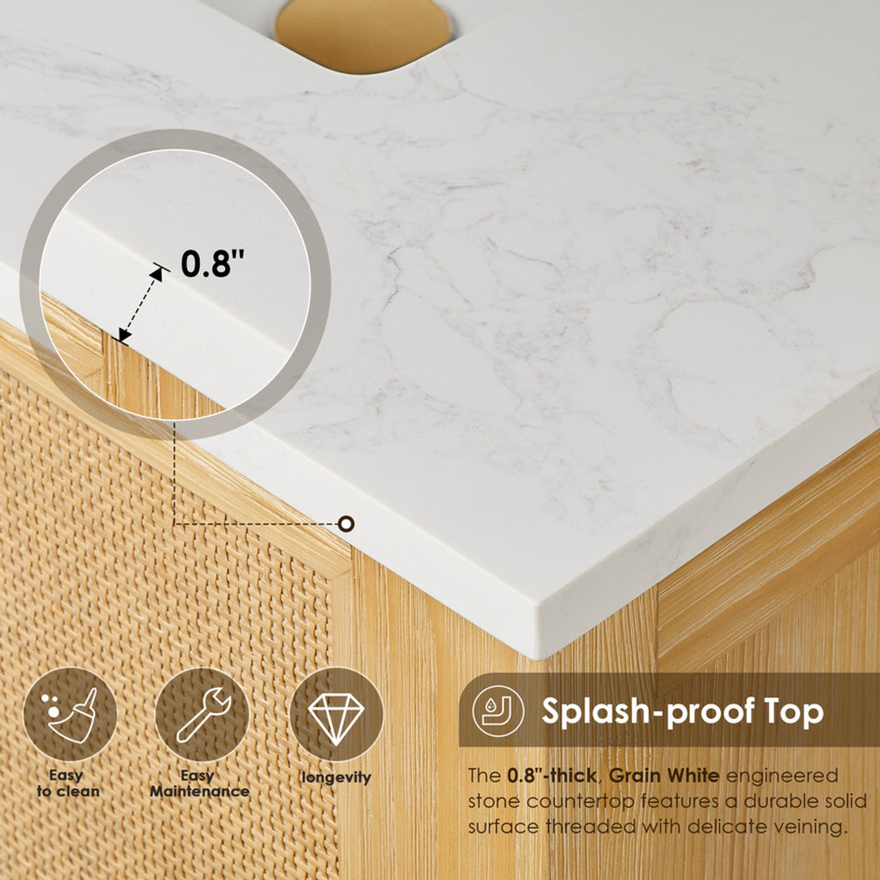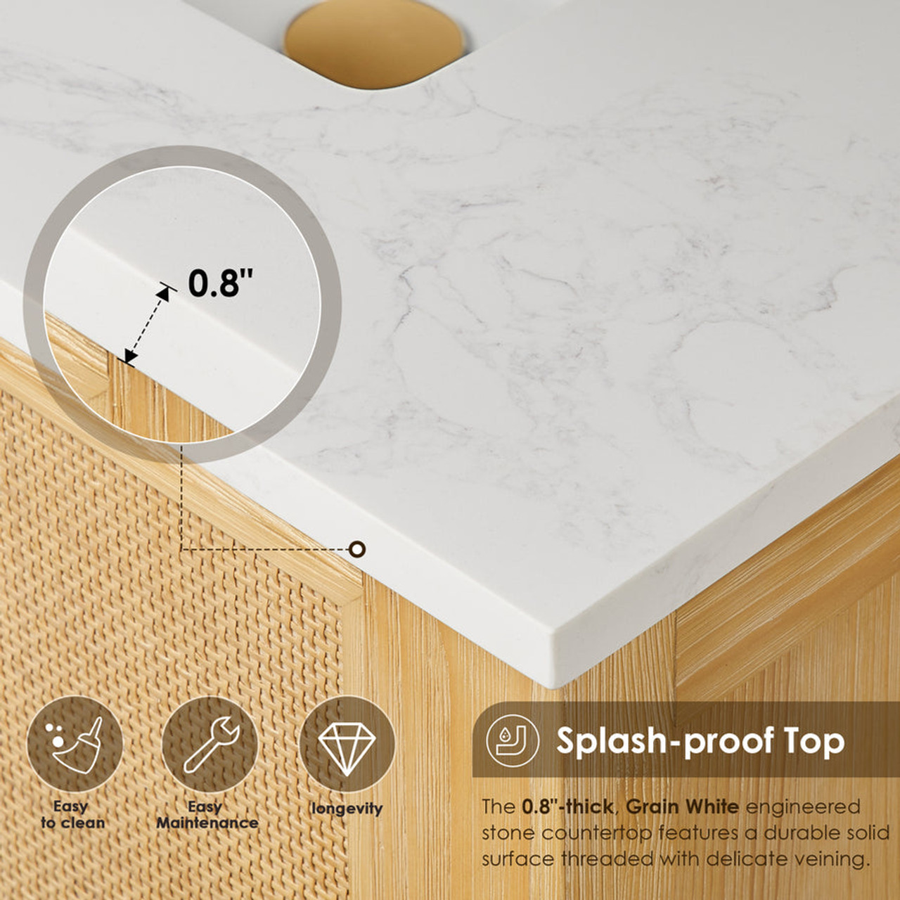 - Splash-proof top: The 0.8"-thick, Grain White engineered stone countertop features a durable solid surface threaded with delicate veining, with a 4” backsplash and sidesplash to protect your walls from sink splashes.
