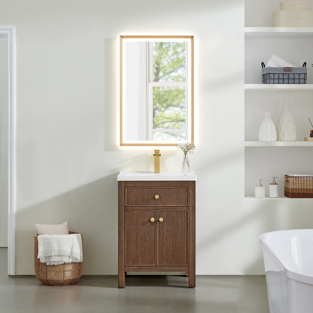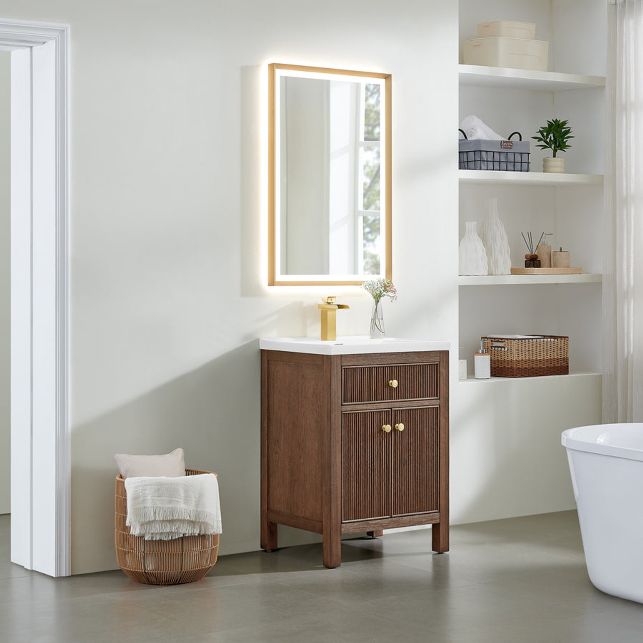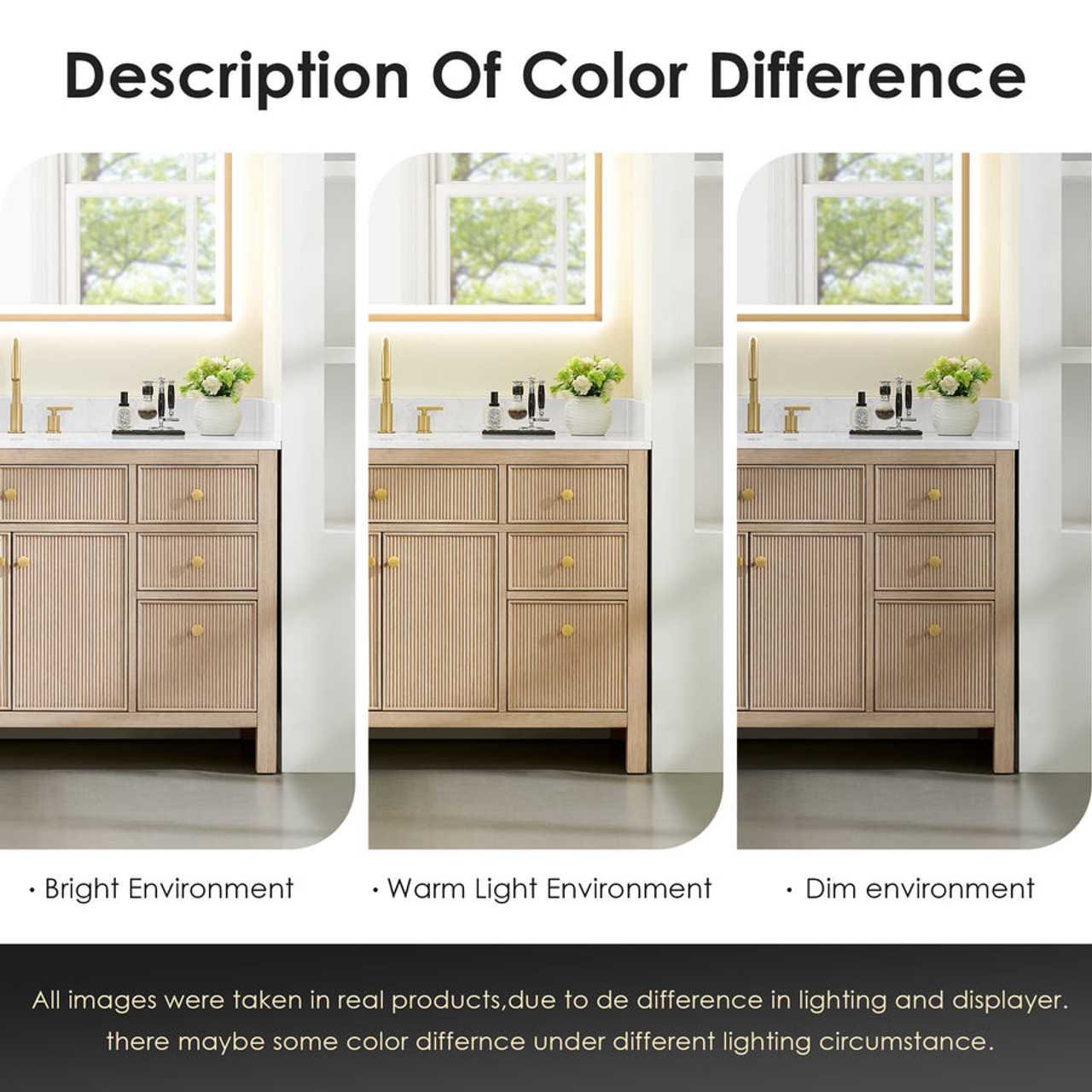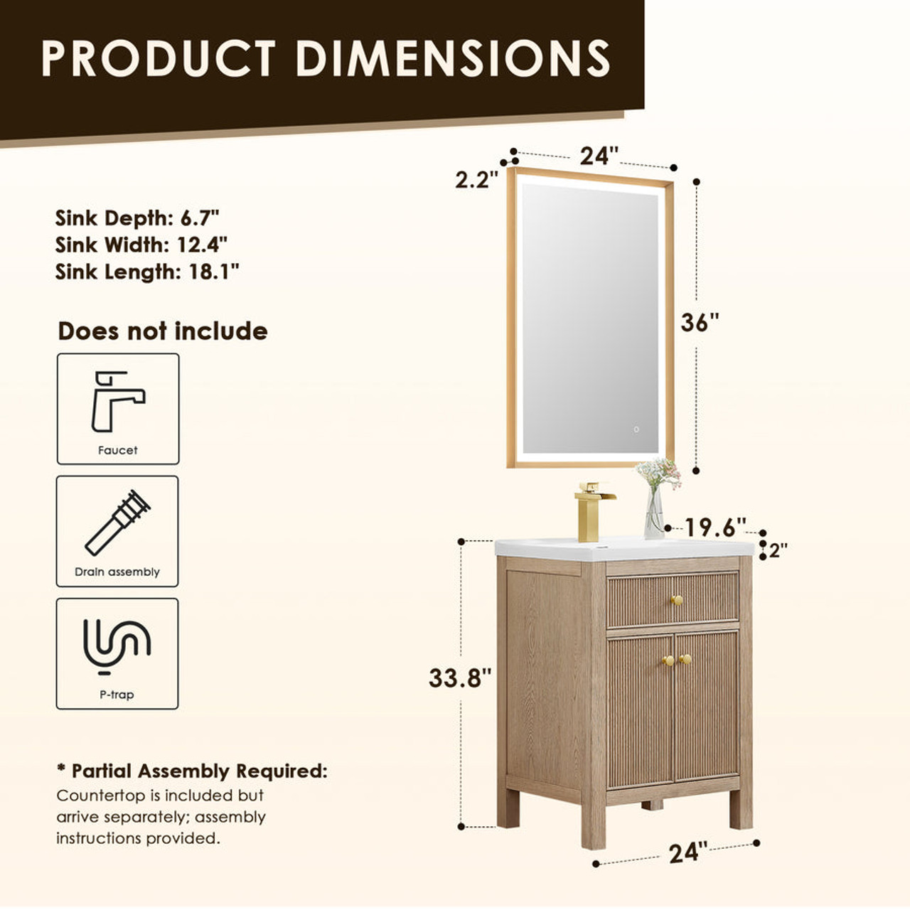 Instantly enhance the aesthetic of your bathroom space with our Cerrito Bathroom Vanity, a fusion of contemporary elegance and natural charm. Crafted from premium spruce wood, this vanity features beautifully fluted doors that showcase the natural wood grain. The sink is designed to keep the bathroom dry and tidy from water spills with its show stopping curved edge barrier. Its countertop is designed with a classic white basin- adding a versatile and timeless touch for any creative bathroom remodel. The Cerrito is the perfect blend of on-trend design and everyday practicality, with soft-closing doors and drawers that keep all your essentials neatly organized and tucked away.
