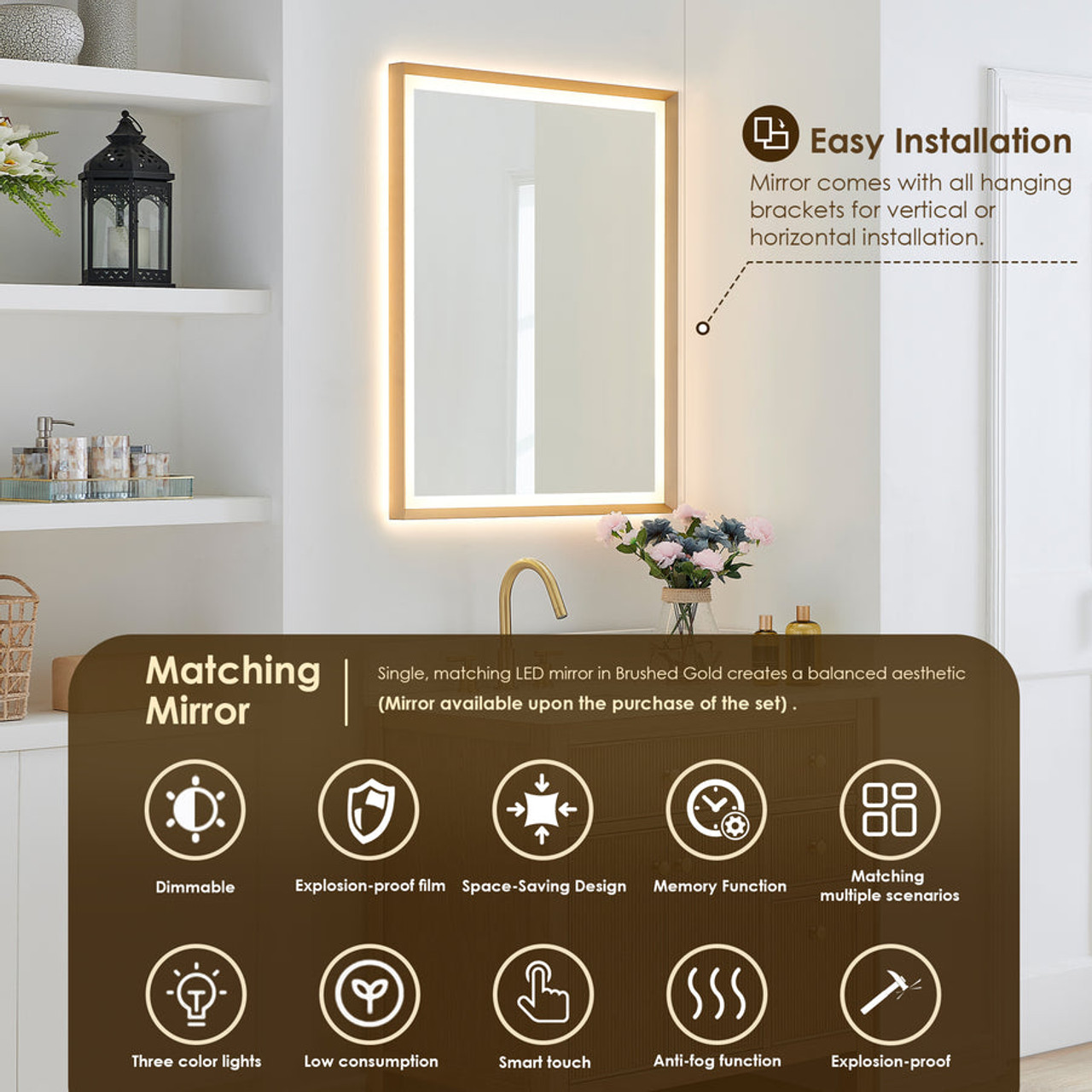 - Matching Mirror(s): Single, matching LED mirror in Brushed Gold creates a balanced aesthetic