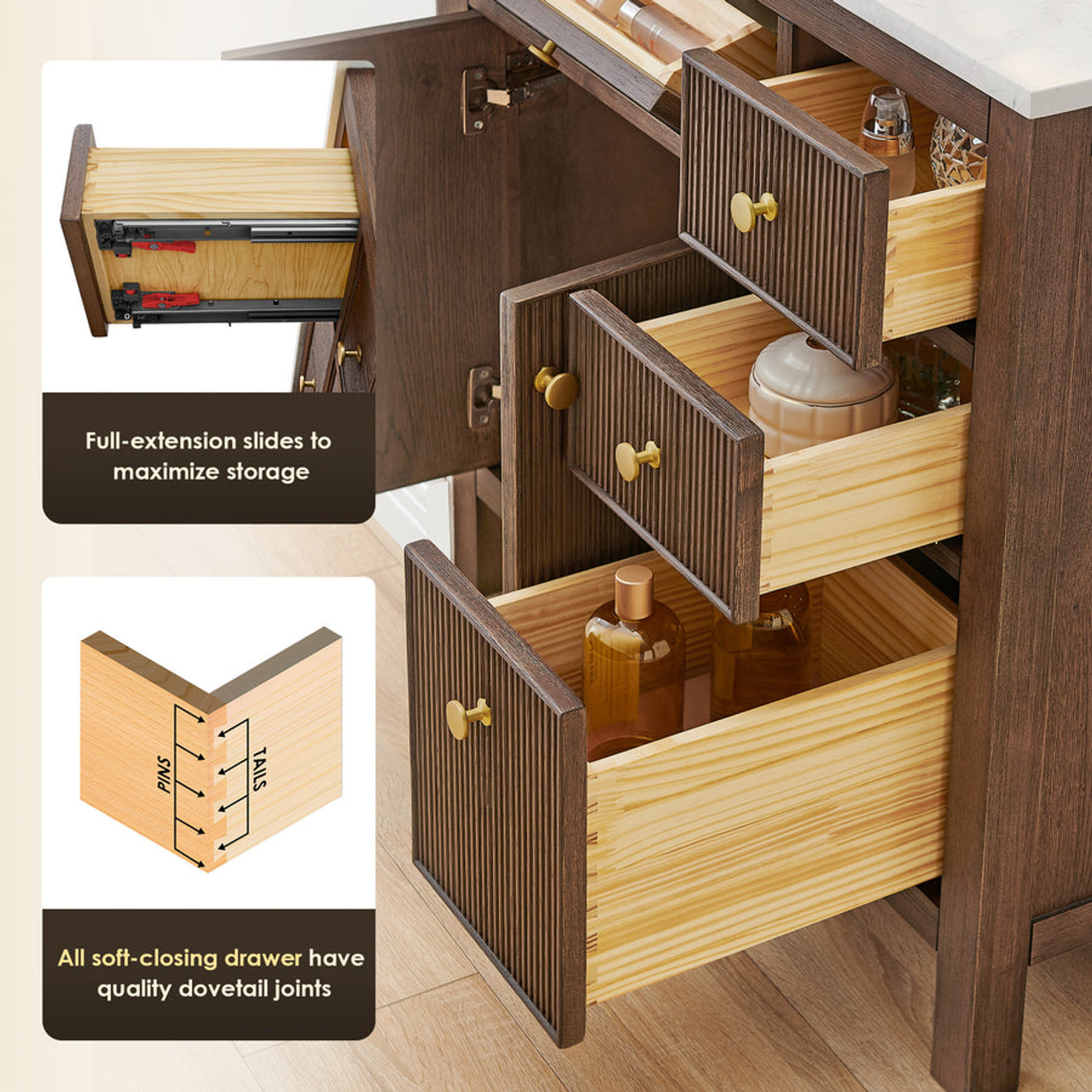 Instantly enhance the aesthetic of your bathroom space with Cerrito Bathroom Vanity, a fusion of contemporary elegance and natural charm. Crafted from premium spruce wood, this vanity features beautifully fluted doors that showcase the natural wood grain and sleek grain white countertop. Protect your walls in style with the optional 4-inch backsplash and sidesplash. The Cerrito is the perfect blend of on-trend design and everyday practicality, with soft-closing doors and drawers that keep all your essentials neatly organized and tucked away.