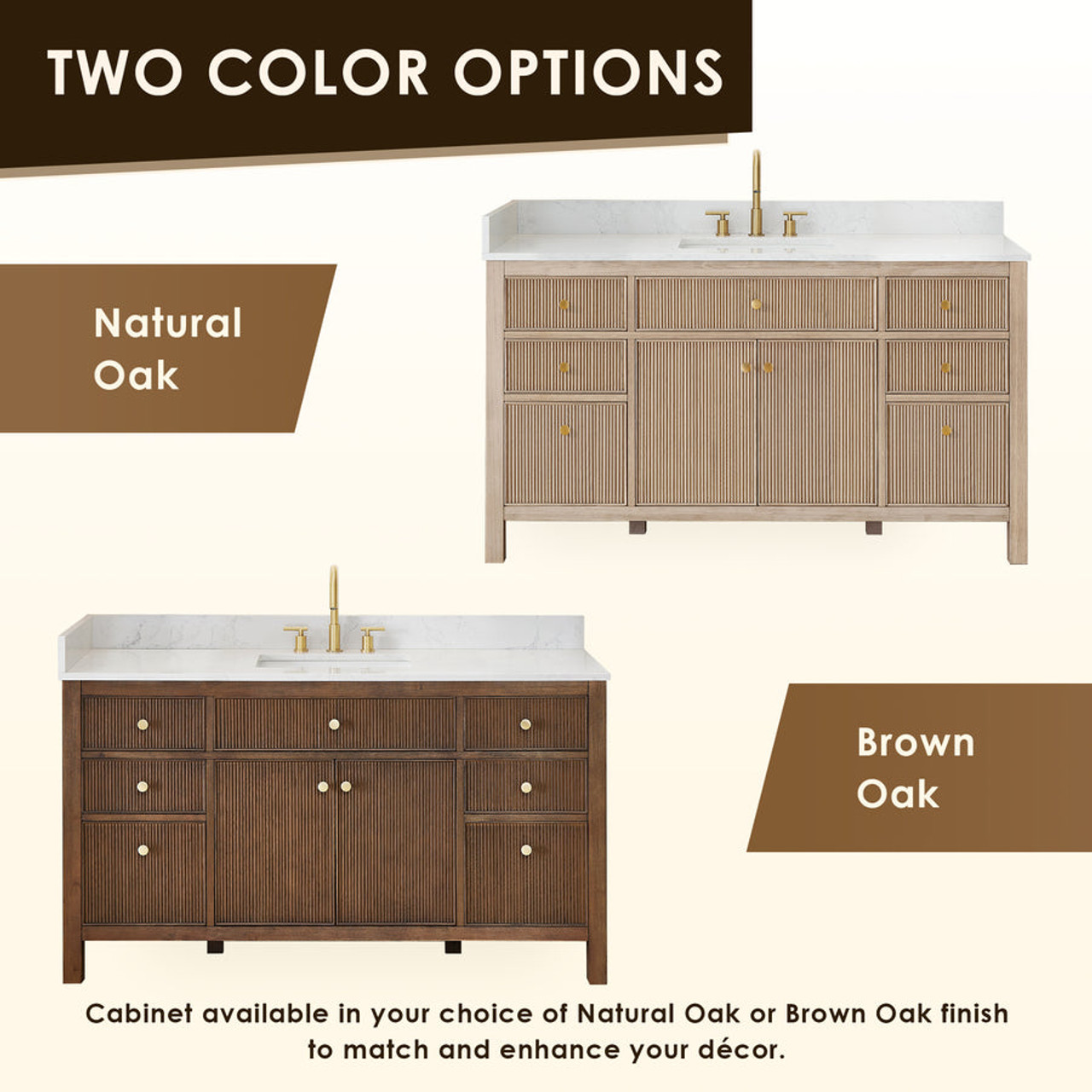 Instantly enhance the aesthetic of your bathroom space with Cerrito Bathroom Vanity, a fusion of contemporary elegance and natural charm. Crafted from premium spruce wood, this vanity features beautifully fluted doors that showcase the natural wood grain and sleek grain white countertop. Protect your walls in style with the optional 4-inch backsplash and sidesplash. The Cerrito is the perfect blend of on-trend design and everyday practicality, with soft-closing doors and drawers that keep all your essentials neatly organized and tucked away.