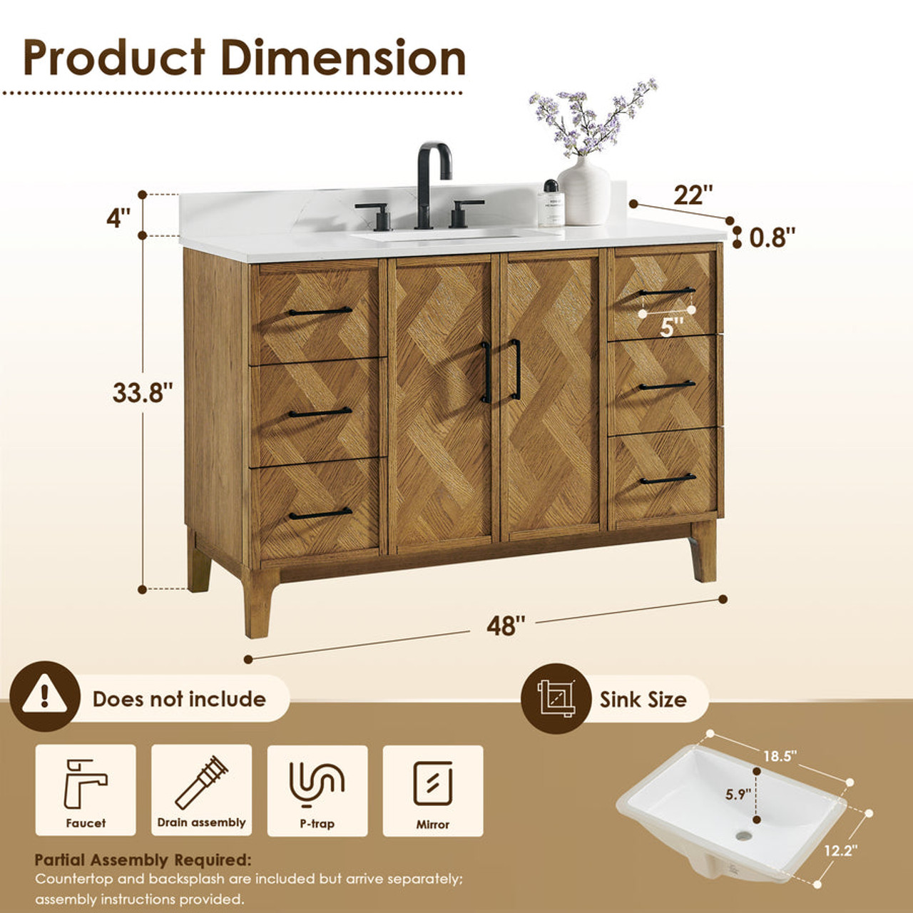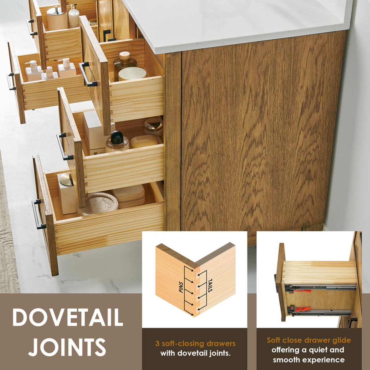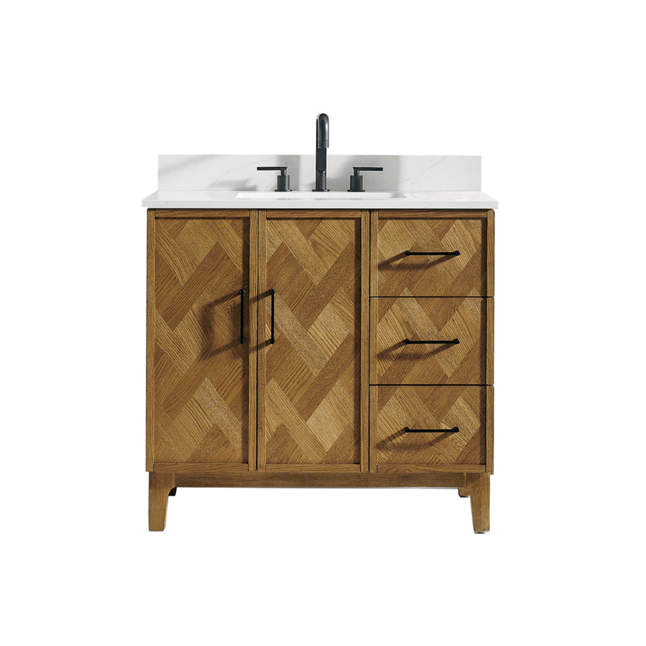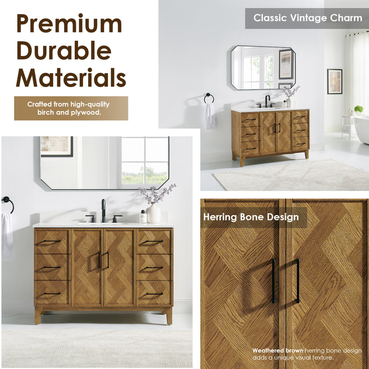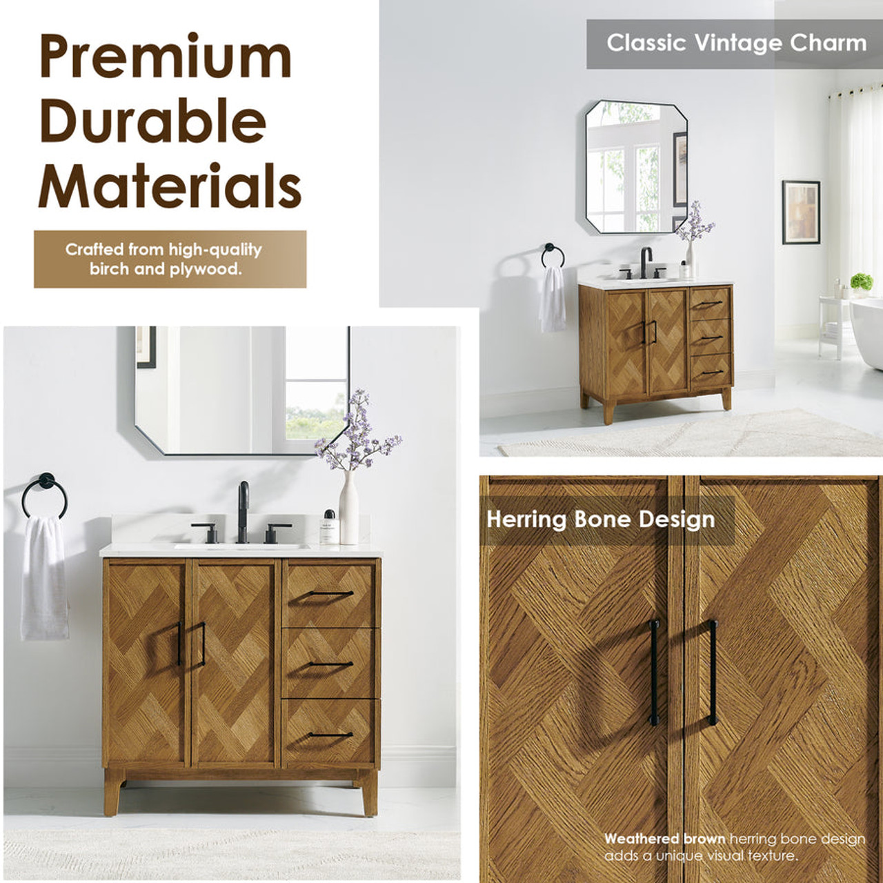Transform your bathroom into a sanctuary of timeless elegance with our vintage-inspired vanity. Featuring exquisite herring bone striped brown detailing, soft-closing dovetailed drawers, and a sleek quartz countertop, it masterfully blends functionality with artistry. The sturdy wood base adds a touch of modern flair, while the weathered brown finish whispers rustic charm, creating a perfect balance of sophistication and warmth. It’s more than a vanity—it’s a statement of refined living. Redefine your bathroom, one detail at a time.