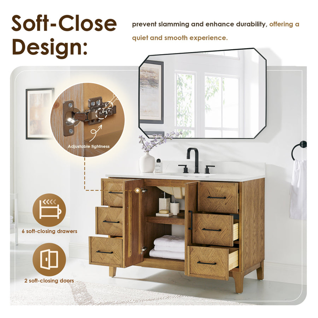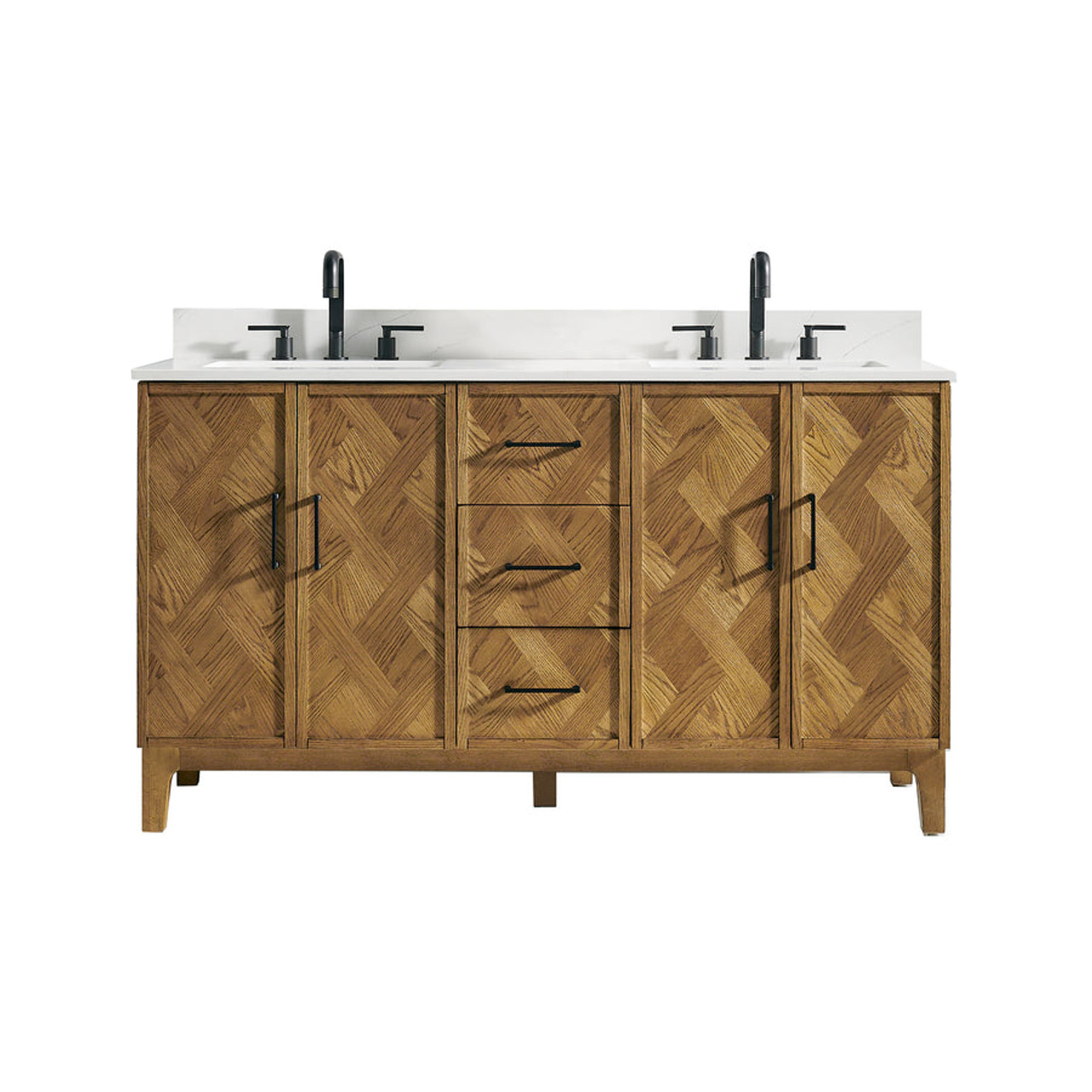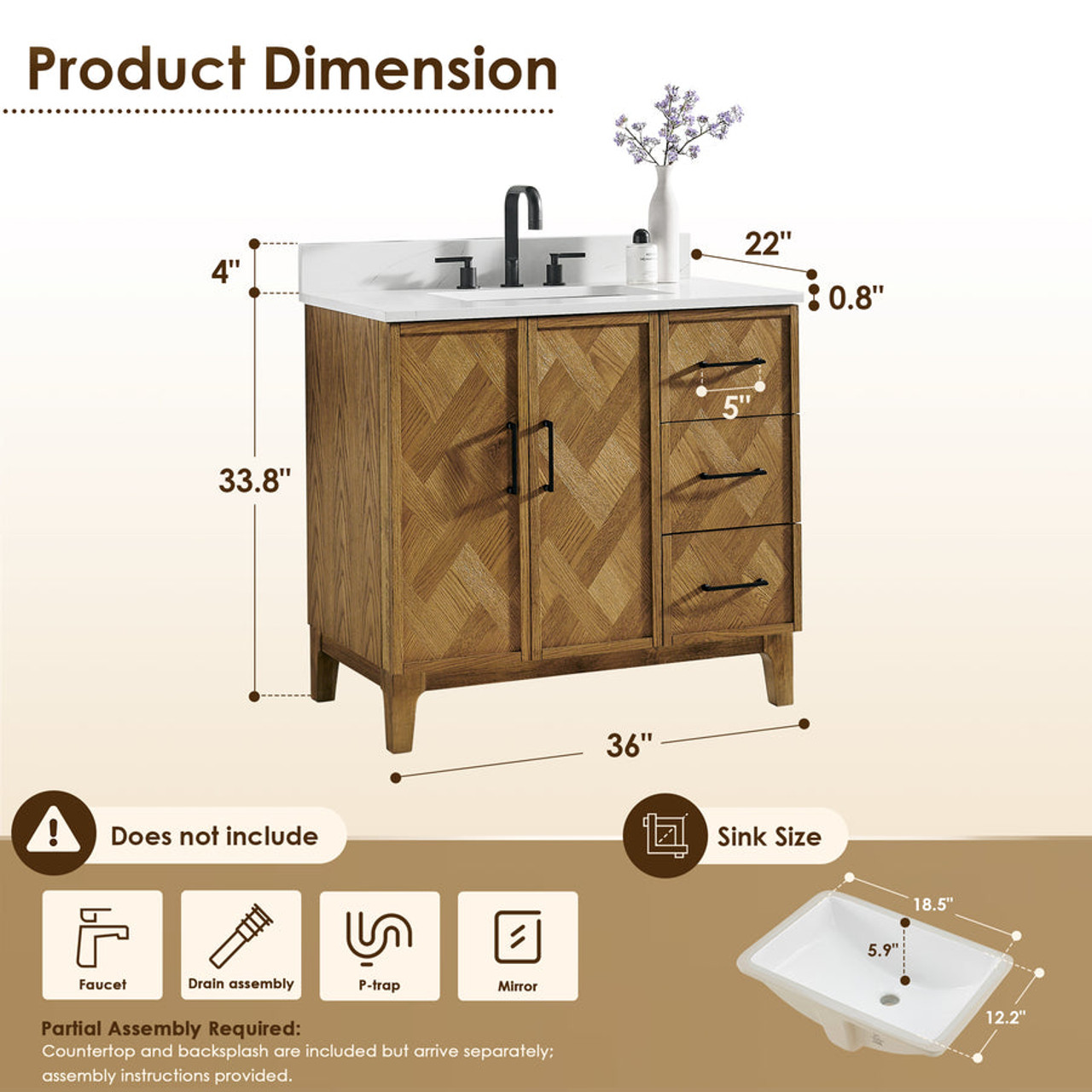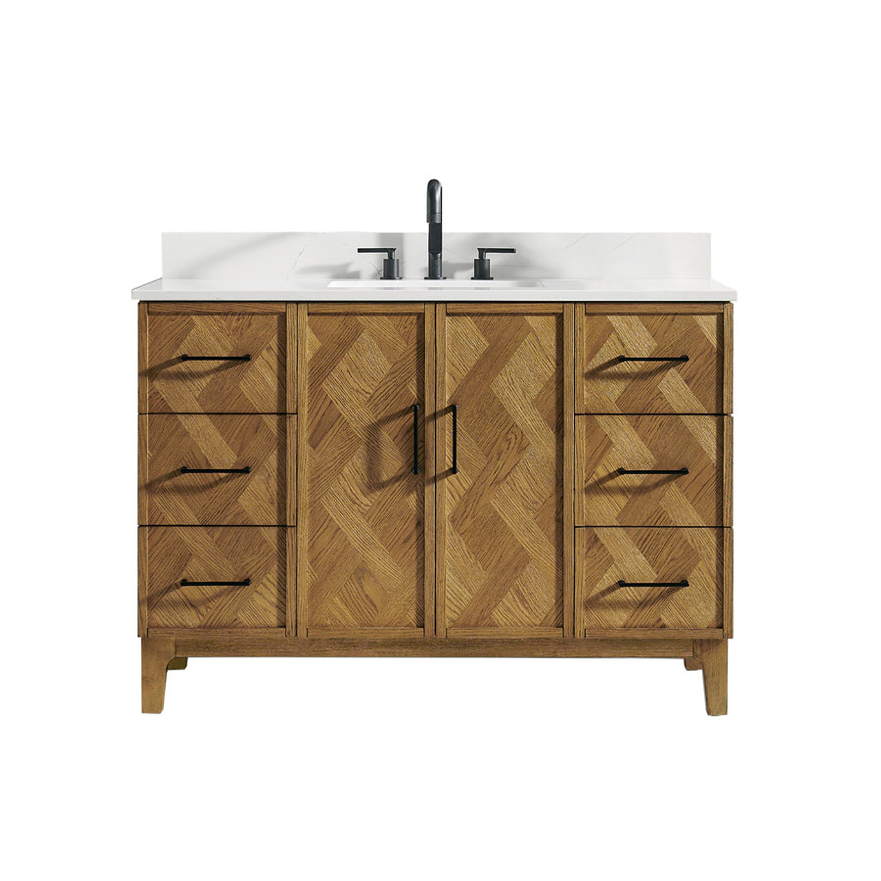 Transform your bathroom into a sanctuary of timeless elegance with our vintage-inspired vanity. Featuring exquisite herring bone striped brown detailing, soft-closing dovetailed drawers, and a sleek quartz countertop, it masterfully blends functionality with artistry. The sturdy wood base adds a touch of modern flair, while the weathered brown finish whispers rustic charm, creating a perfect balance of sophistication and warmth. It’s more than a vanity—it’s a statement of refined living. Redefine your bathroom, one detail at a time.