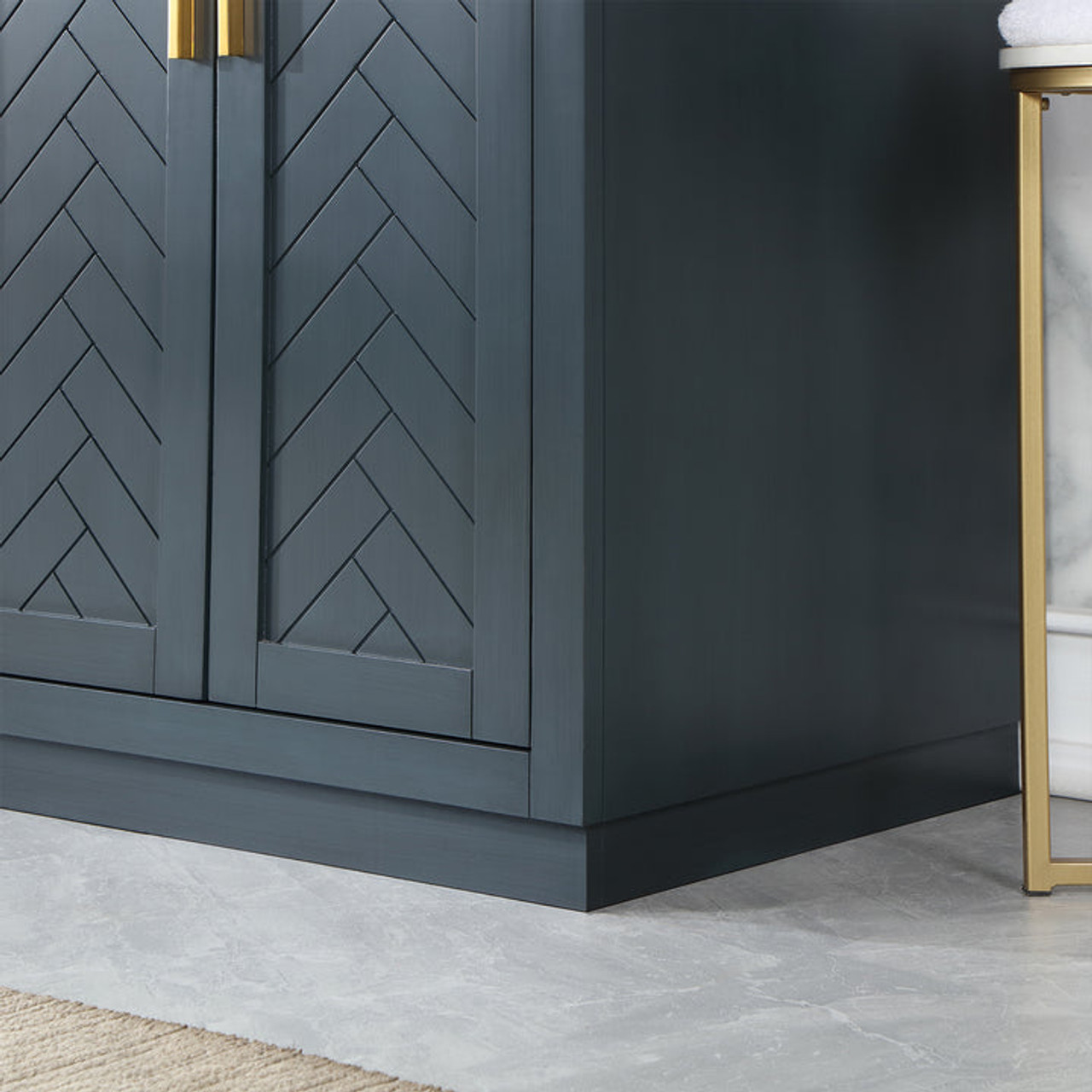 Perfect for the contemporary bathroom, our Clarity&main Vanity offers the smart style you want with the everyday functionality you need. Architectural details include textured door panels with a chic chevron pattern as well as a recessed plinth base. Constructed of rugged wood materials, this vanity boasts ample and flexible storage space for all your bath essentials. The marbled composite stone countertop lends a touch of refinement while providing a striking contrast with the dark-colored modern cabinet.