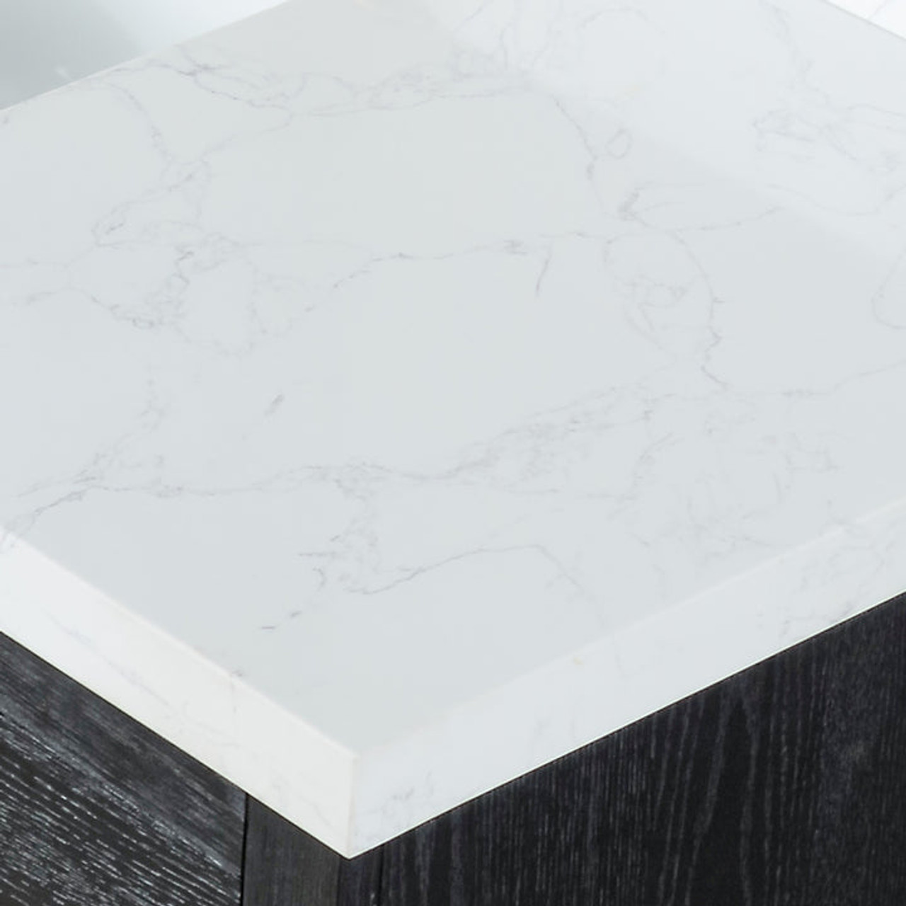 Perfect for the contemporary bathroom, Clarity&main Vanity offers the smart style you want with the everyday functionality you need. Architectural details include textured door panels with a chic chevron pattern as well as a recessed plinth base. Constructed of rugged wood materials, this vanity boasts ample and flexible storage space for all your bath essentials. The marbled Engineered Stone Countertop lends a touch of refinement while providing a striking contrast with the dark-colored modern cabinet.