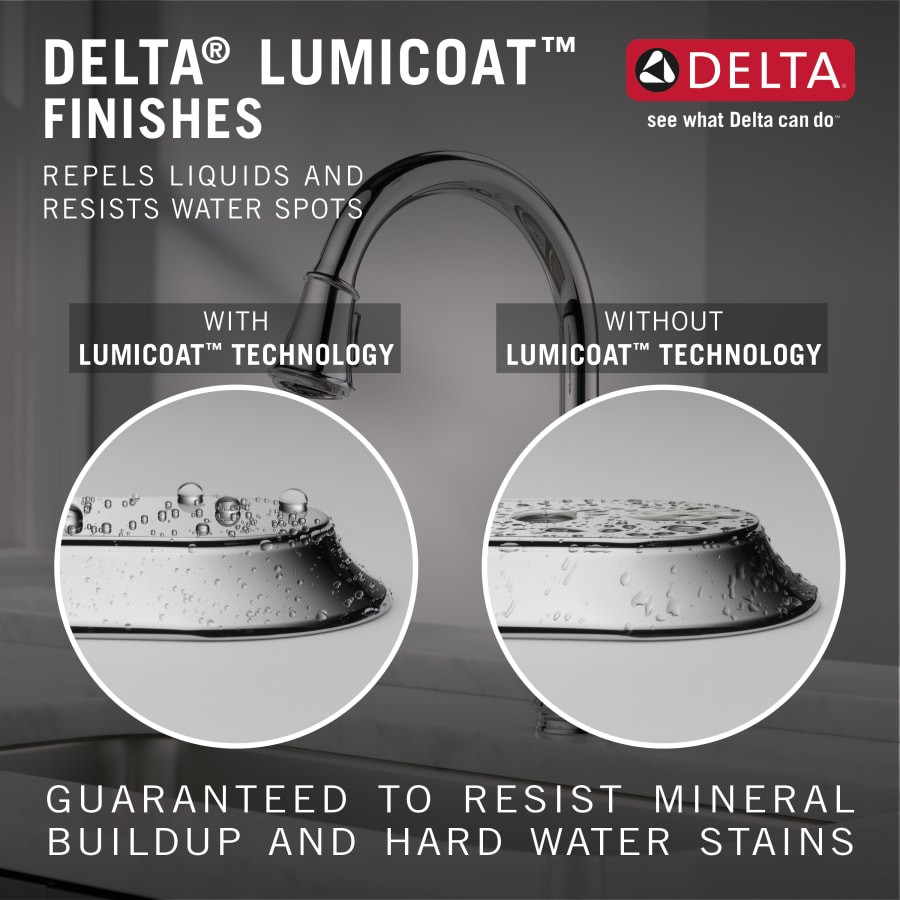- Lumicoat: Lumicoat finishes easily wipe clean without the need for cleaners or chemicals and help resist mineral buildup and hard water stains. The ultra-sleek surface repels liquids, resisting water spots and staying cleaner longer, so your faucet stays beautiful. Available on Lumicoat marked finishes.