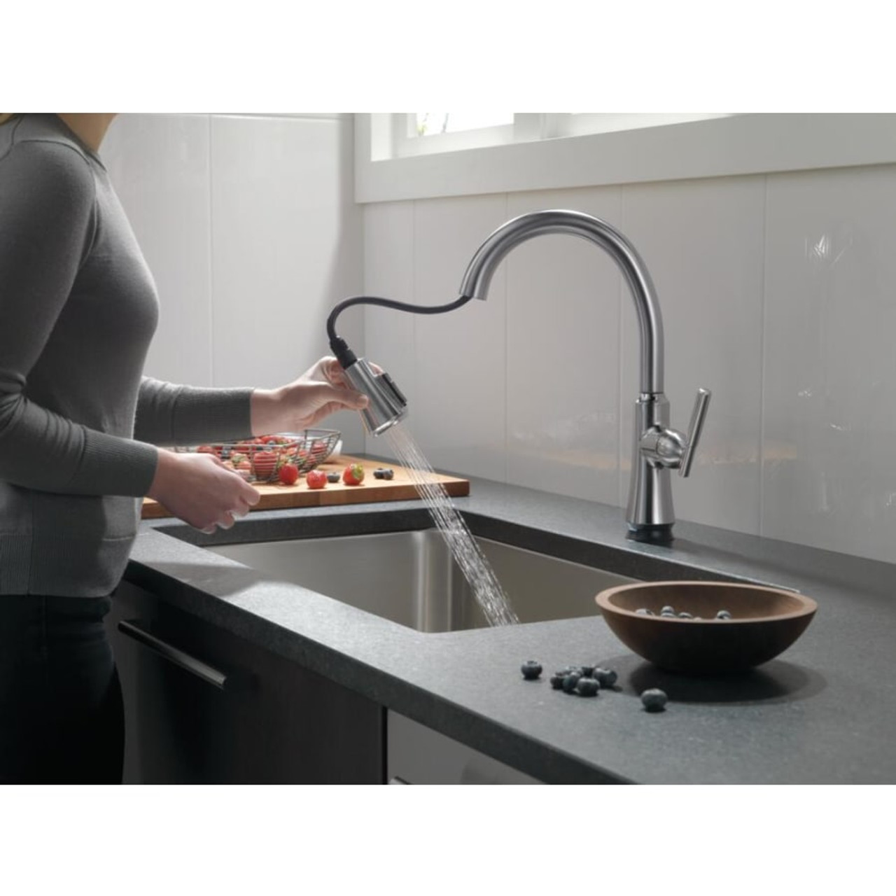 - Touch2O® Technology: Helps keep your faucet clean, even when your hands aren't. A simple touch anywhere on the spout or kitchen faucet handle with your wrist or forearm activates the flow of water at the temperature where your faucet handle is set.