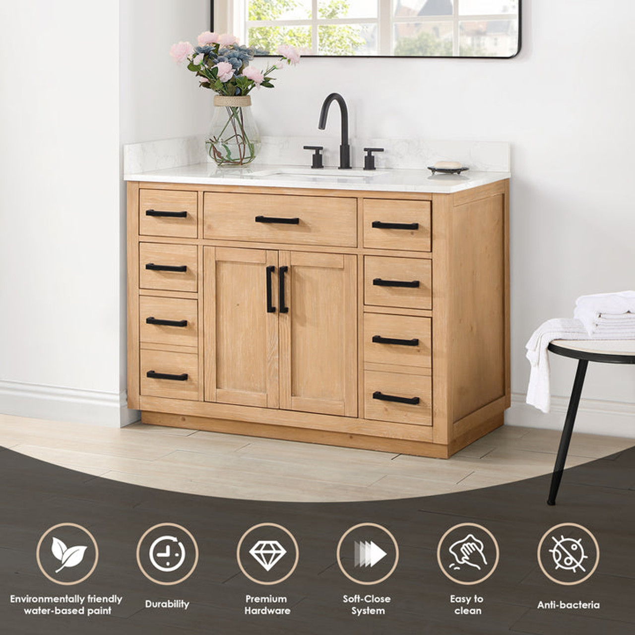 - Our bathroom vanity features eco-friendly water-based paint, ensuring a beautiful finish with minimal environmental impact.