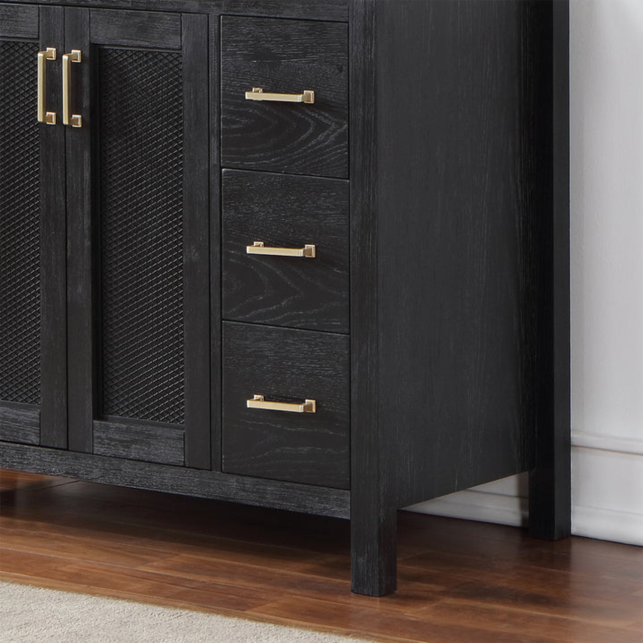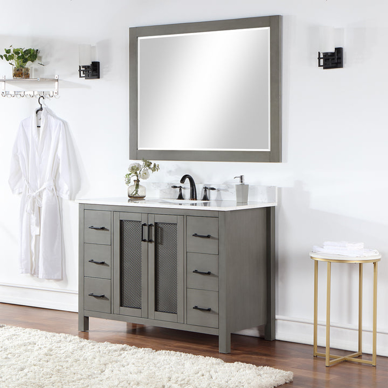 With its compelling blend of wood, metal, and stone, our Hadiya Vanity has an industrial style edge. Metal mesh inserts on the cabinet doors lend a dash of bold texture, concealing spacious storage for stowing away towels, cleaning supplies, and toiletries. Soft-closing drawers provide additional storage flexibility to help keep your space tidy. This sturdy and well-constructed vanity is capped with a beautiful, easy-to-clean composite-stone countertop that provides a stunning parallel with the natural wood grain.
