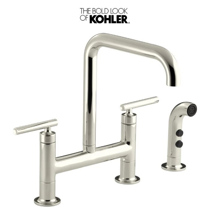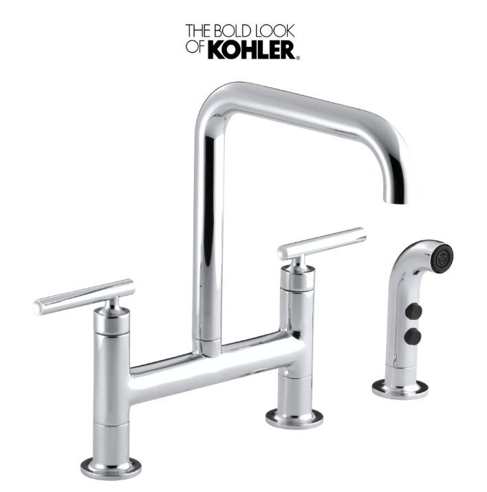 Pairing a classic bridge design with bold new touches, this Purist kitchen faucet combines distinctive modern style and easy-to-use features. The high-arch spout provides 10 inches of clearance and rotates 360 degrees, making way for your largest pots and pans. Extended lever handles offer plenty of grip area.