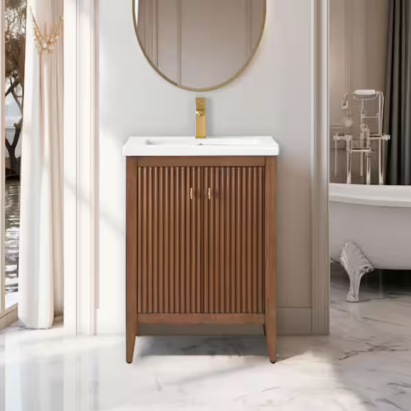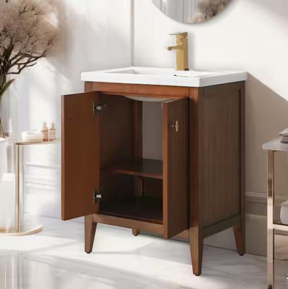 Compact and functional 24" Vanity in Solid Wood Walnut finish, ceramic integrated top.