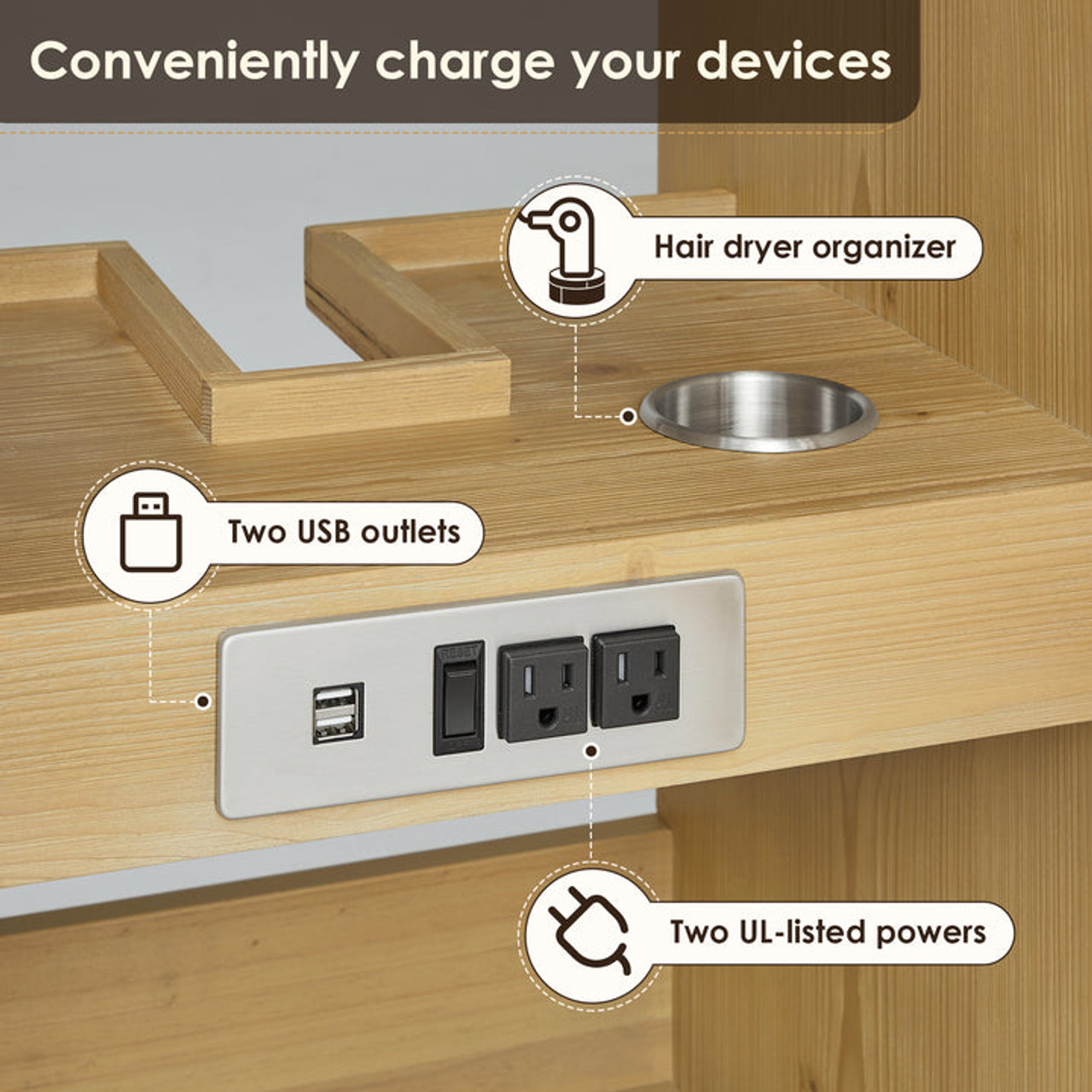 - Equipped with UL-listed power and USB outlets to conveniently charge your devices, and power bathroom essentials.