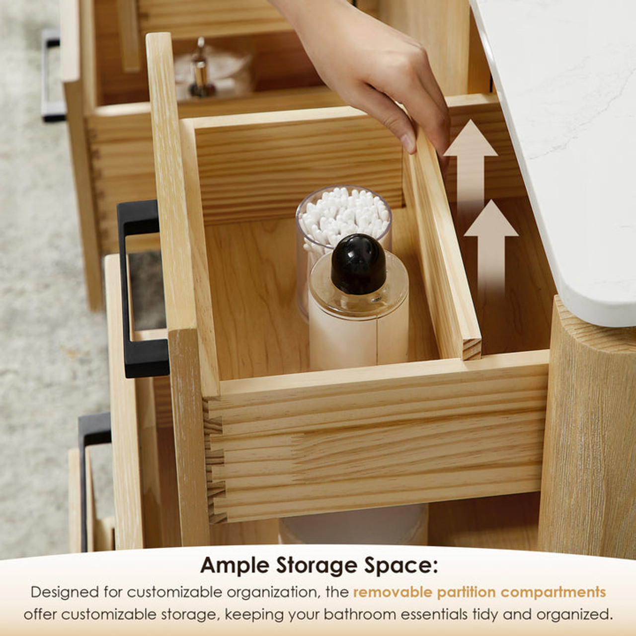 Looking to add style and warmth to your bathroom space? Our Serene vanity combines sleek design with exceptional functionality, featuring a rich Nature Brown finish that brings a natural feel and sophistication to your bathroom. The recessed plinth base gives the vanity a sleek, floating appearance, while the rounded edges of both the vanity and countertop create a soft, contemporary look that feels inviting and modern. Meticulously designed for a clutter-free experience, our vanity features removable partition compartments that can be customized to suit your needs, ensuring your engineered stone takes center stage. Equipped with UL-listed power and USB outlets, this vanity offers convenient charging and power options, seamlessly blending style, organization, and functionality.