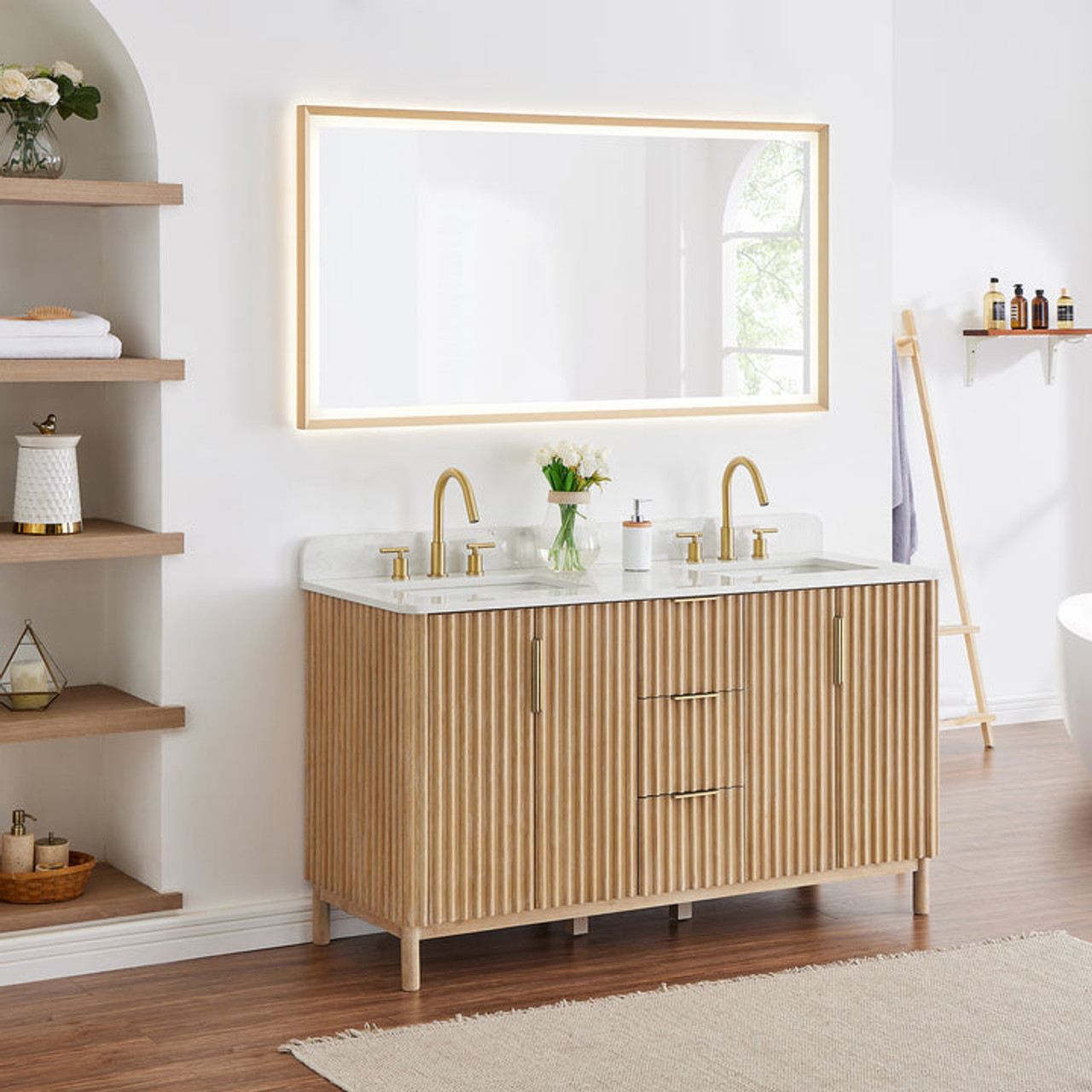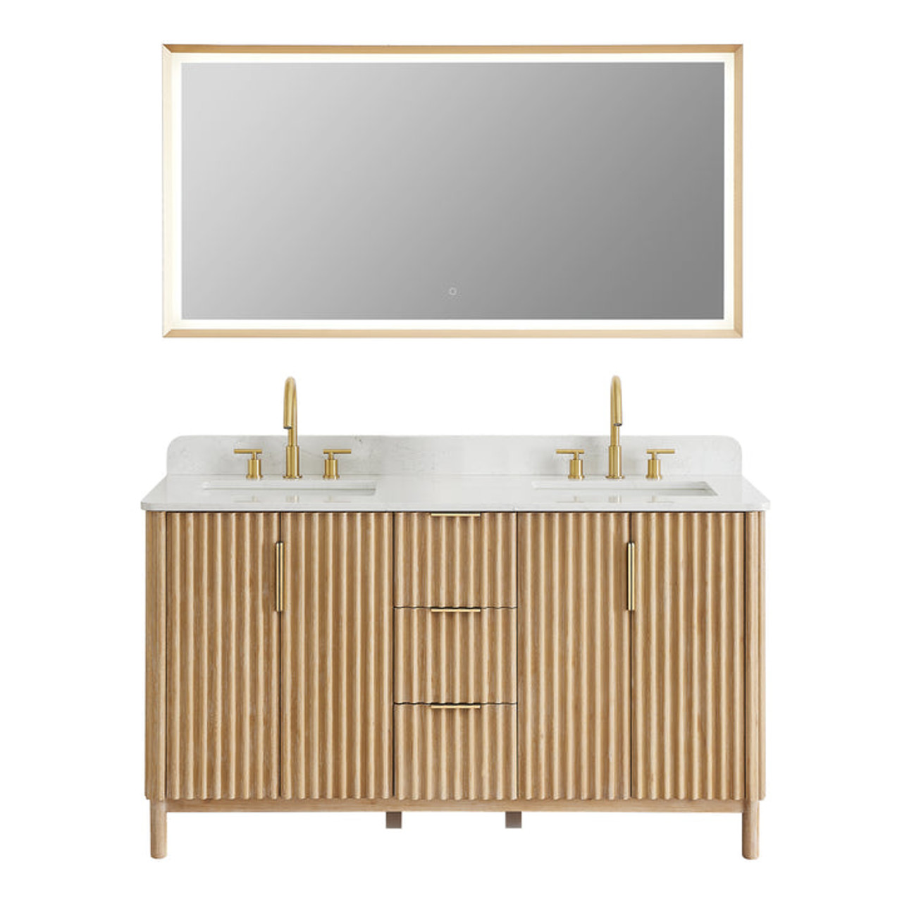 - Matching Mirror(s): Single, matching LED mirror in Brushed Gold creates a balanced aesthetic