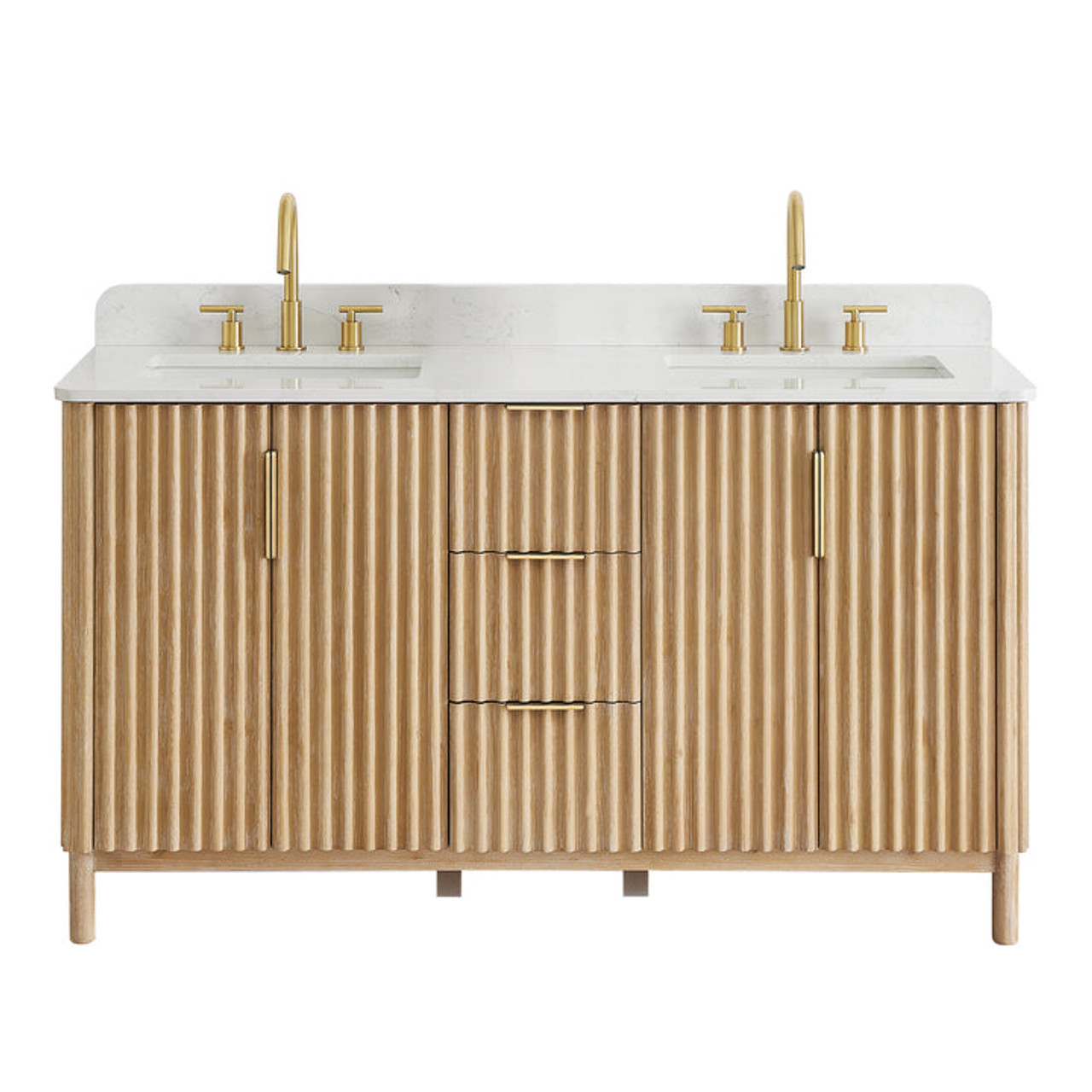 Balancing sophisticated accents with natural tones and textures, the elegant Sierra Series Bathroom Vanity is a striking style upgrade for your bathroom space. The captivating reeded design of the cabinet and door panels lends a unique, artisanal aesthetic that catches the eye. Rounded corners on the composite stone top provide a fluid, uninterrupted silhouette, while gold ergonomic door handles and drawer pulls lend sleek contrast to the finished wood grain. The cabinet includes built-in UL-Listed power and USB outlets as well as a convenient hair dryer organizer. Supported by thick, sturdy legs crafted from premium hardwood, the durable Sierra promises years of enduring beauty and functionality.