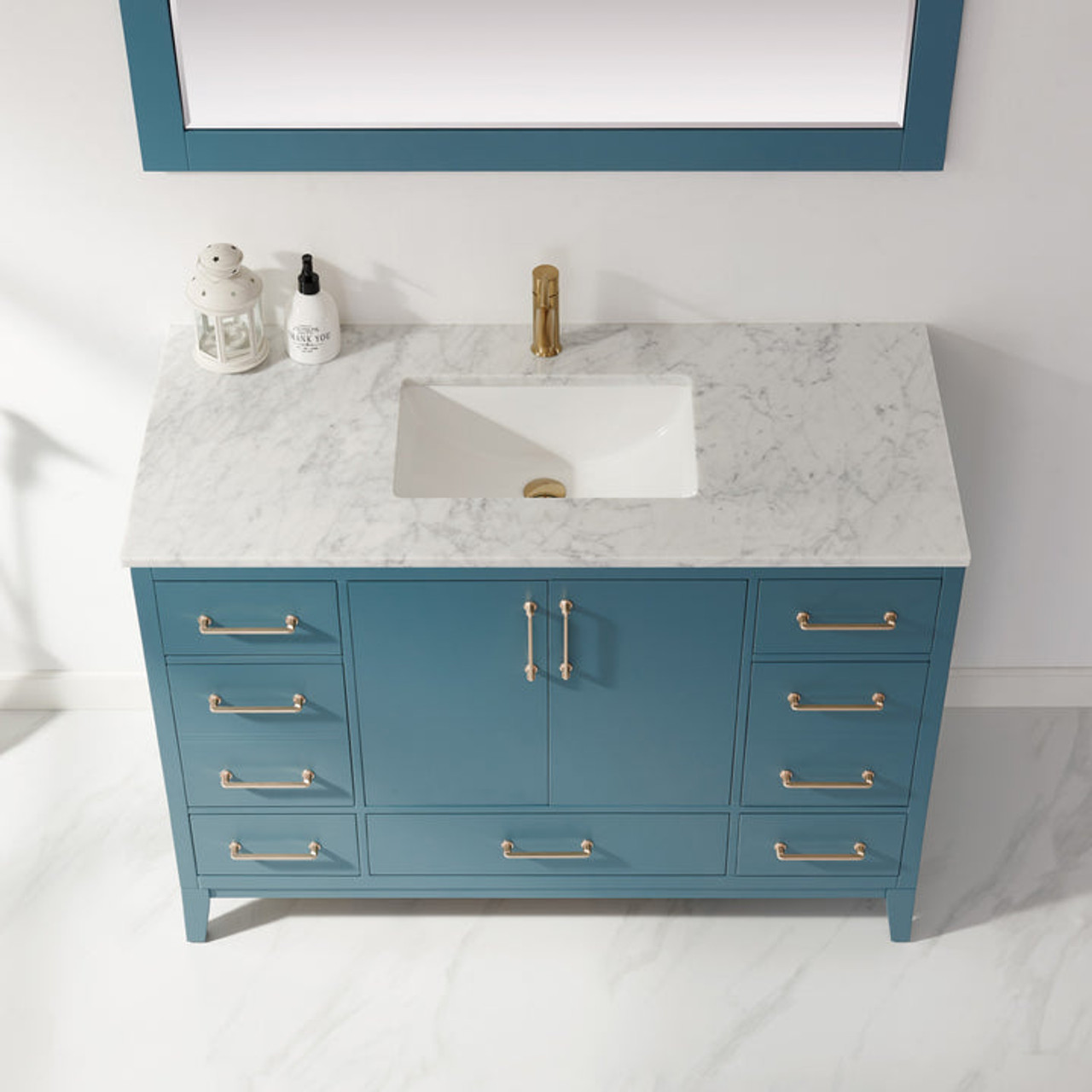 Clean, refined and elegant: that’s the essence of the Sutton Vanity. This beautiful, sturdy furnishing offers an eye-catching medley of finishes, from the gorgeous marble countertop and smooth cabinets to the golden-toned hardware. You’ll love all the storage inside—perfect for housing your favorite towels and other bathroom essentials.