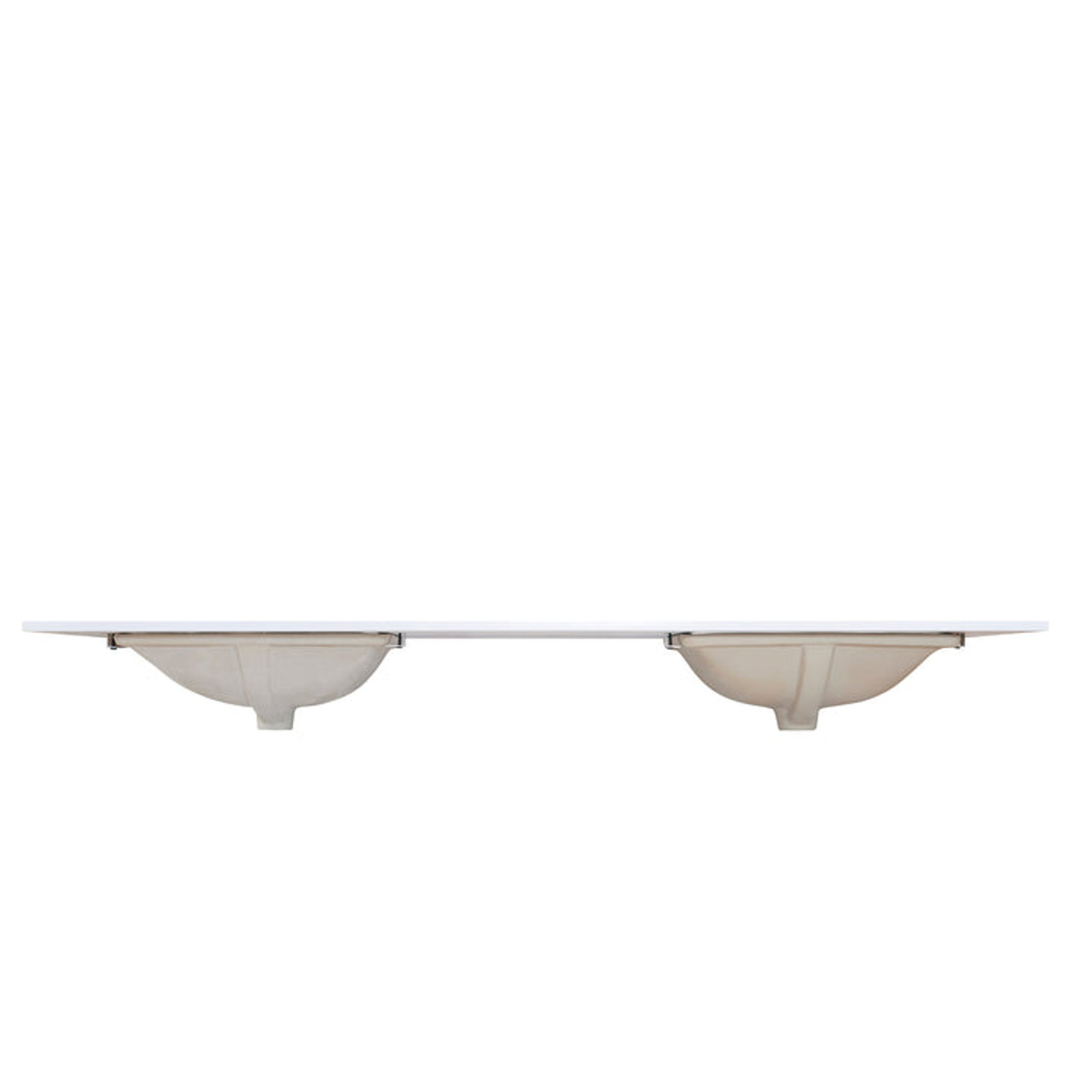 - Two rectangular, undermount ceramic basins with safety overflow hole