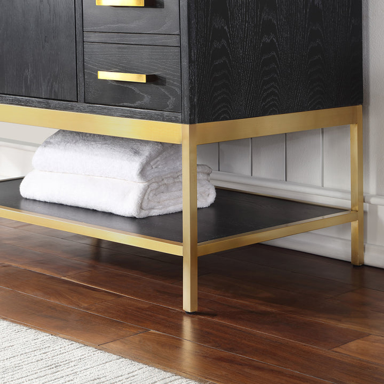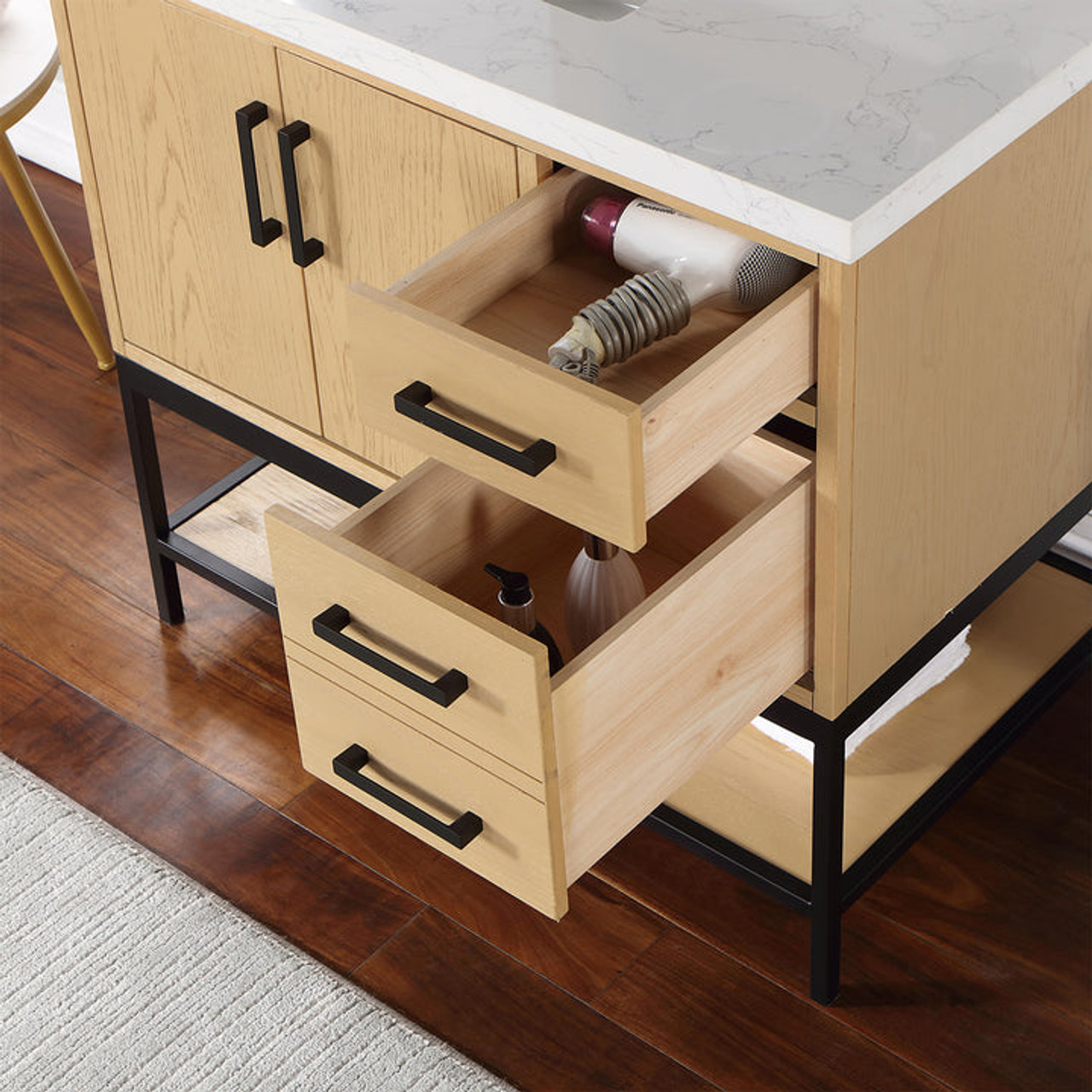 Looking to add style and warmth to your bathroom space? Featuring an exciting blend of textures and storage options, our Wildy Vanity Series embodies a fresh, modern aesthetic with an industrial edge. This piece doesn’t skimp on space, with a roomy main cabinet and full-extension, soft-closing drawers atop an open metal frame. A bottom open shelf adds optional storage or display space for luxury towels. The cabinet is adorned with a solid composite stone countertop featuring exquisite marbling and an easy-to-clean surface.